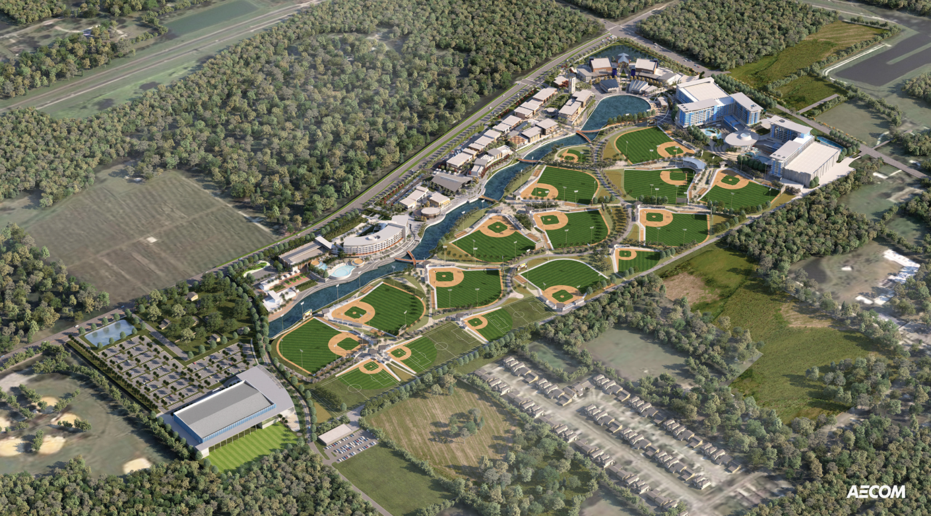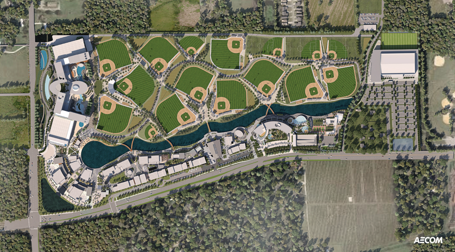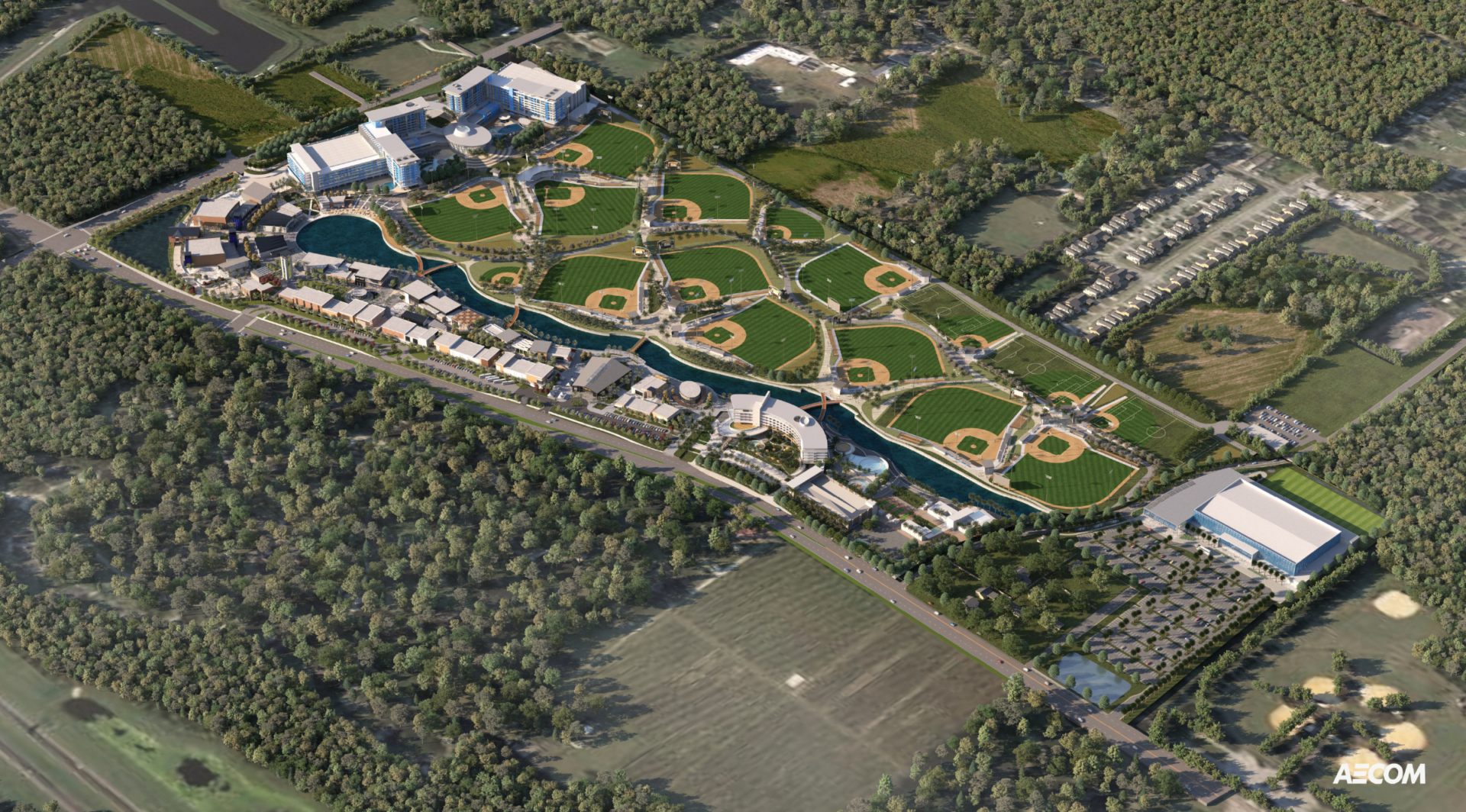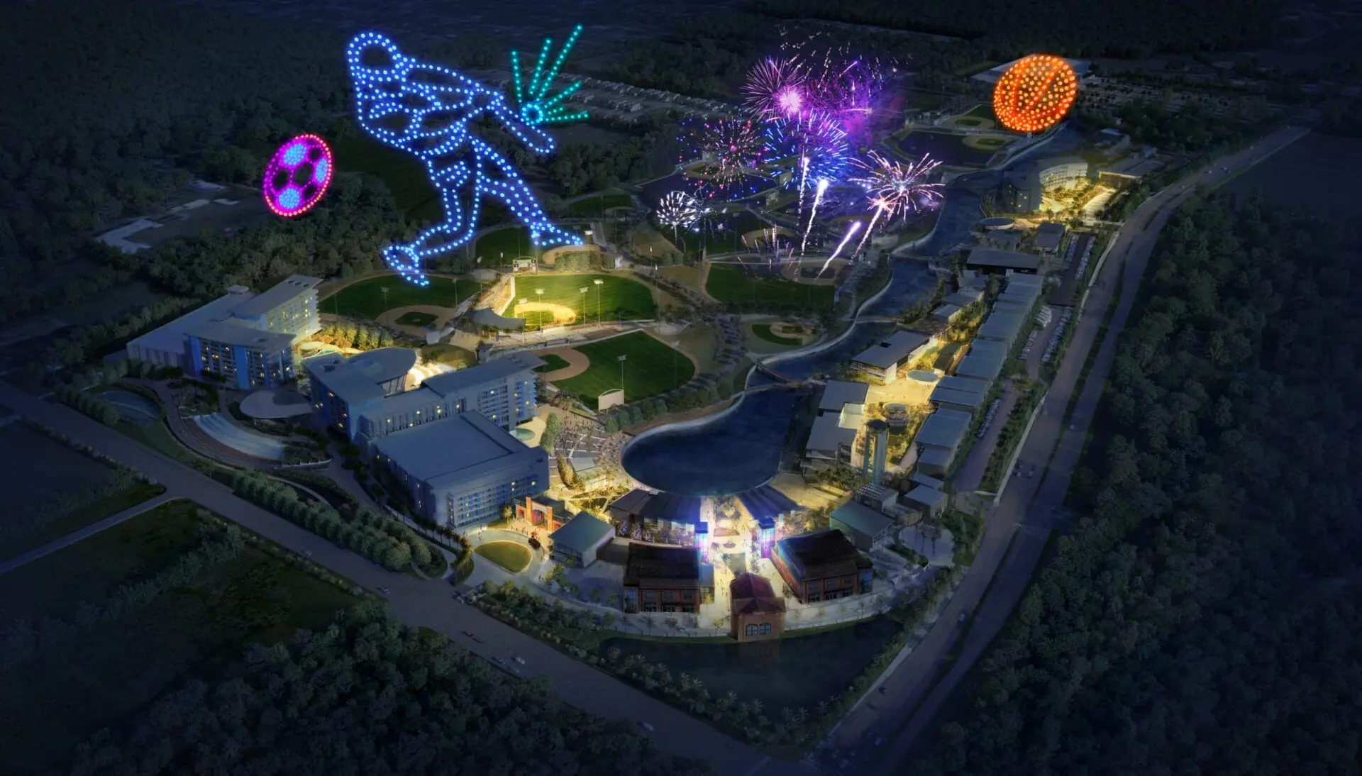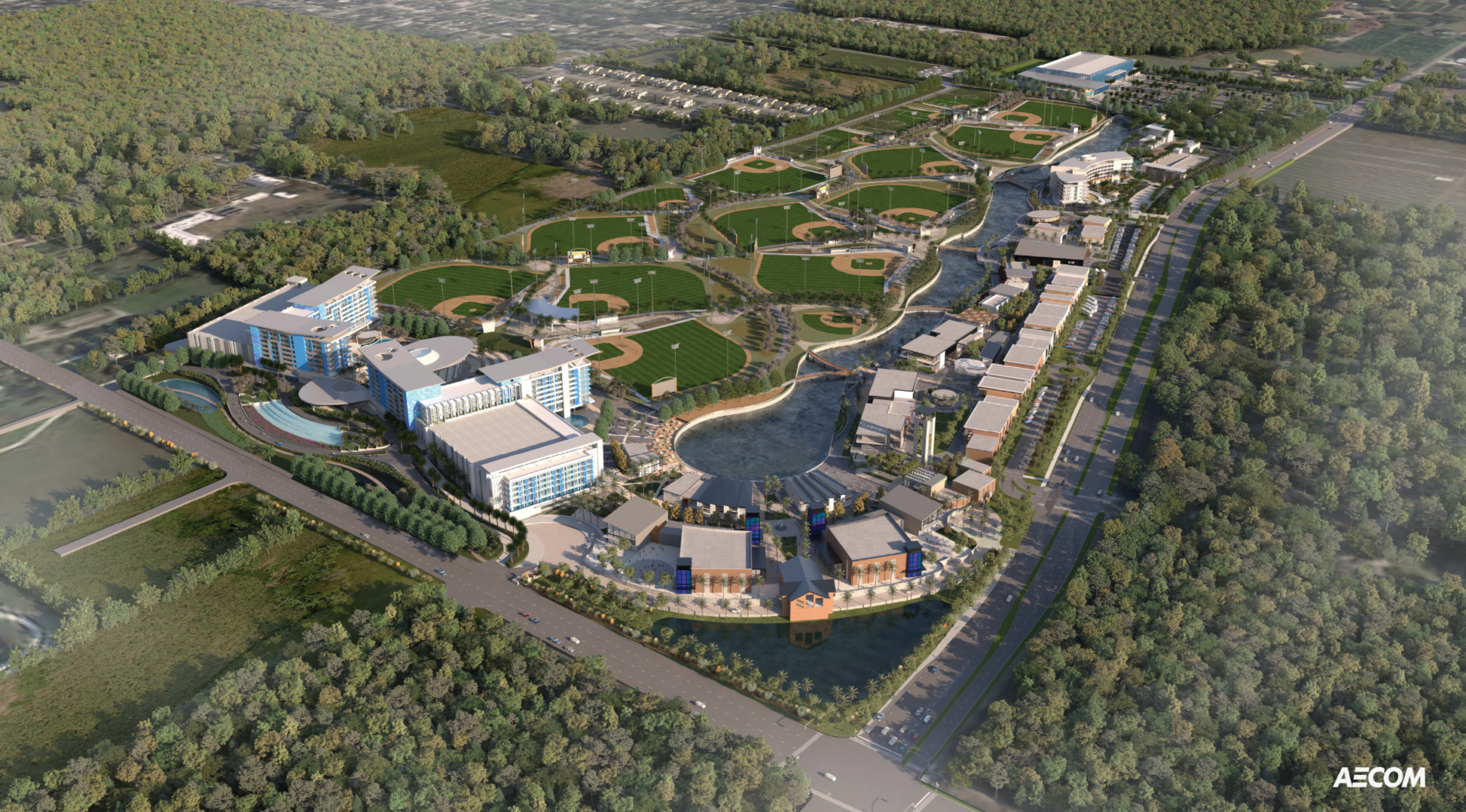 The development will also include two full-service hotels totaling over 1,100 rooms and 350,000 square feet of dining, retail, and entertainment space arranged along a pedestrian-oriented riverwalk. The project is structured around a “one-campus, one-cost” model, designed to reduce the travel and lodging burden for families attending youth tournaments.