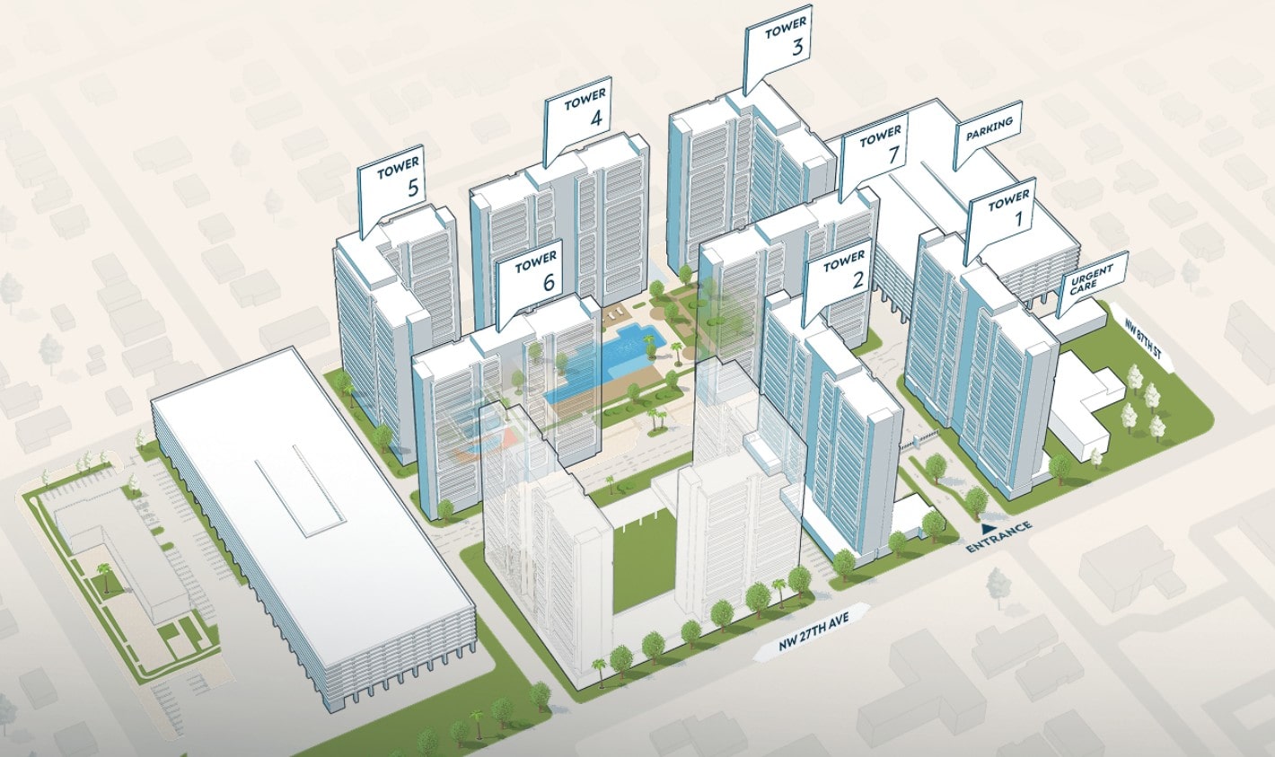 A future on-site school is also planned. The development is situated within a five-minute drive of Miami Dade College North Campus and near several other higher education institutions and major hospitals.