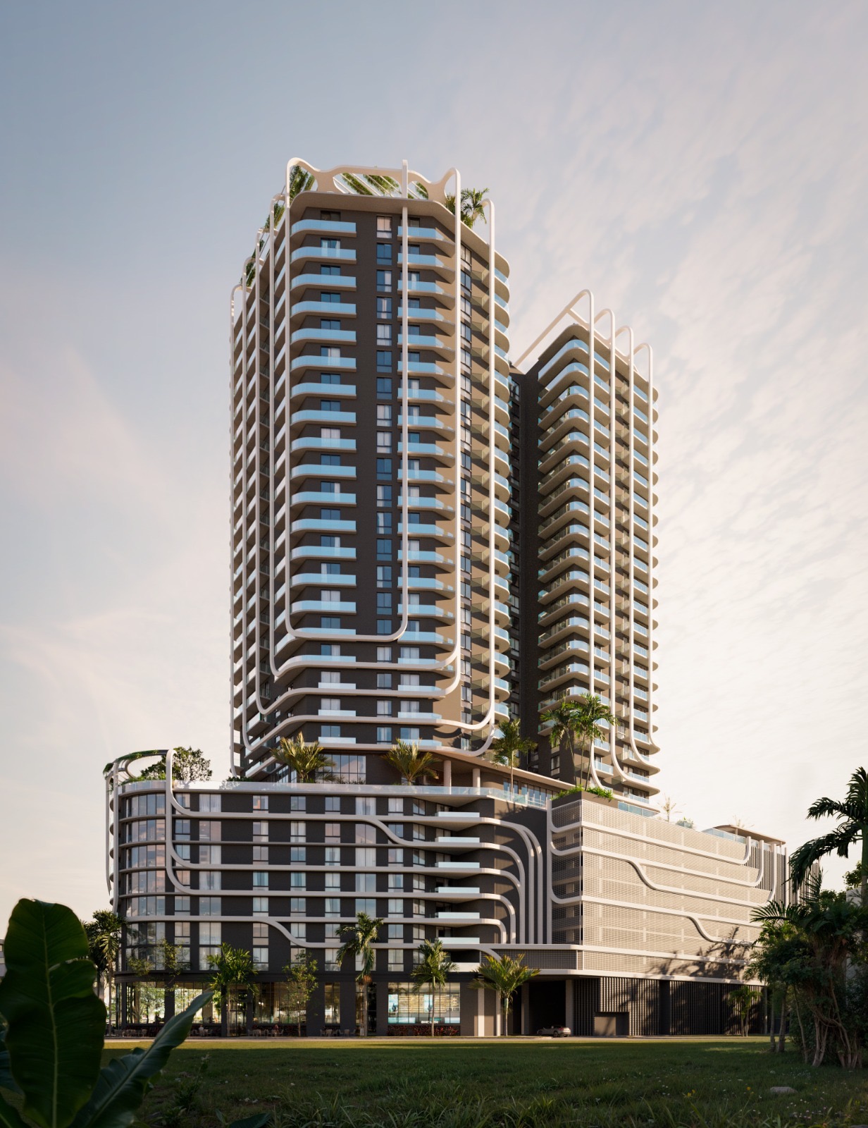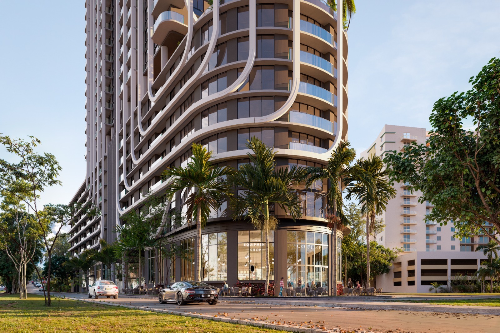 The design by Corwil Architects emphasizes fluidity and movement, with the white structural ribbons wrapping around the building’s rounded corners and reinforcing the tower’s vertical thrust. The bands create a cohesive visual language across the podium and tower, carving out sculptural recesses for landscaped terraces and resident balconies. The podium is articulated with the same curvature, softening the base of the building and providing a layered transition from the public realm to the residential experience above. As the tower rises, the uninterrupted flow of these lines enhances the perception of height while lending the building a distinct and memorable silhouette in Miami’s evolving urban skyline.