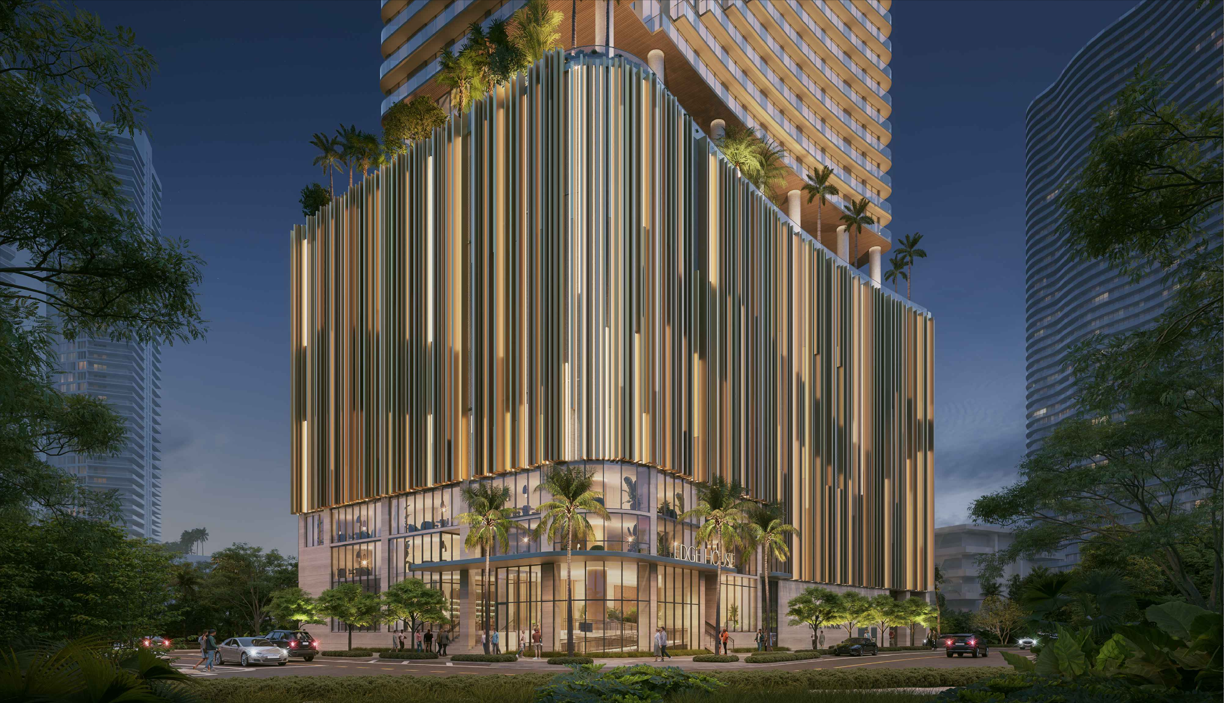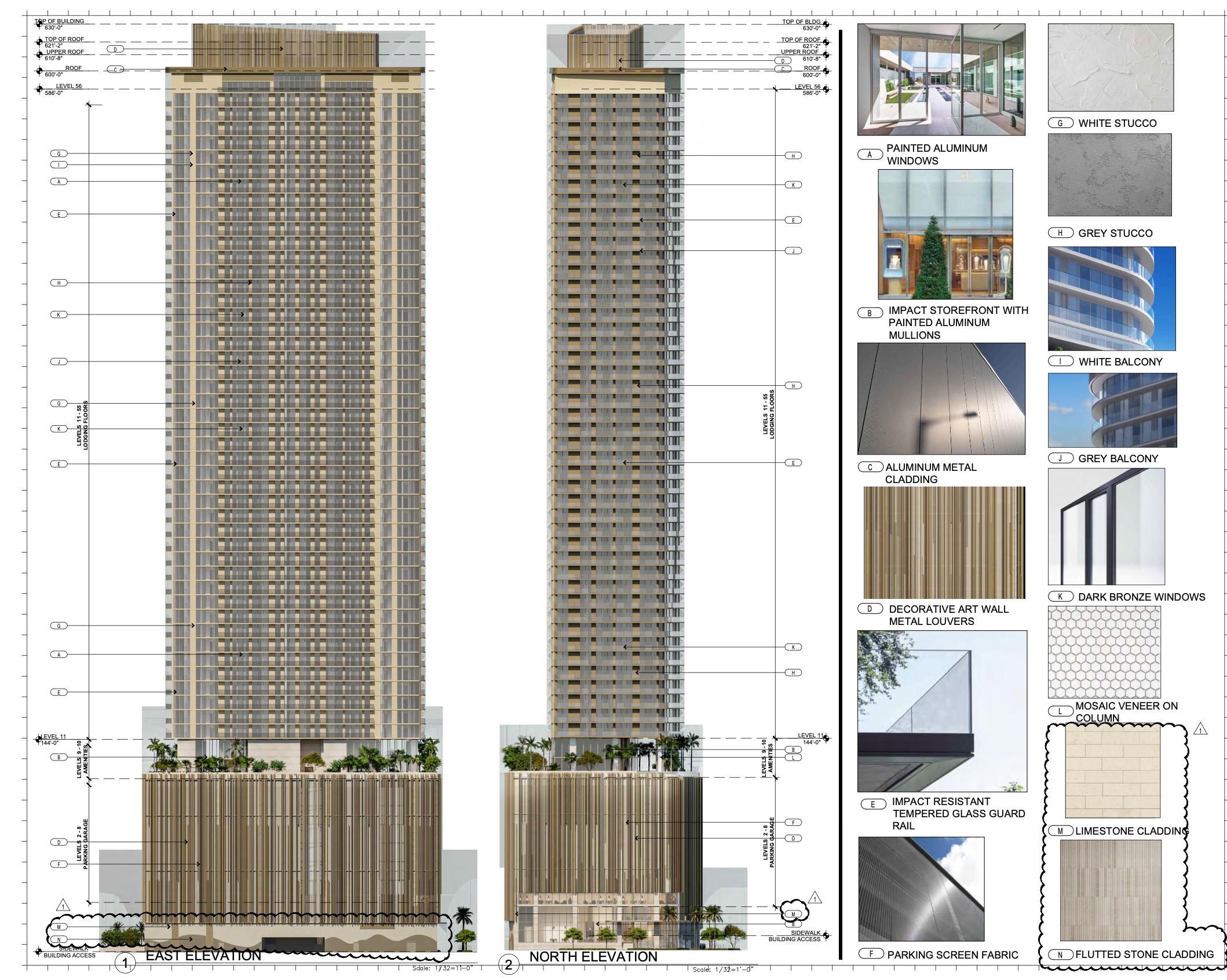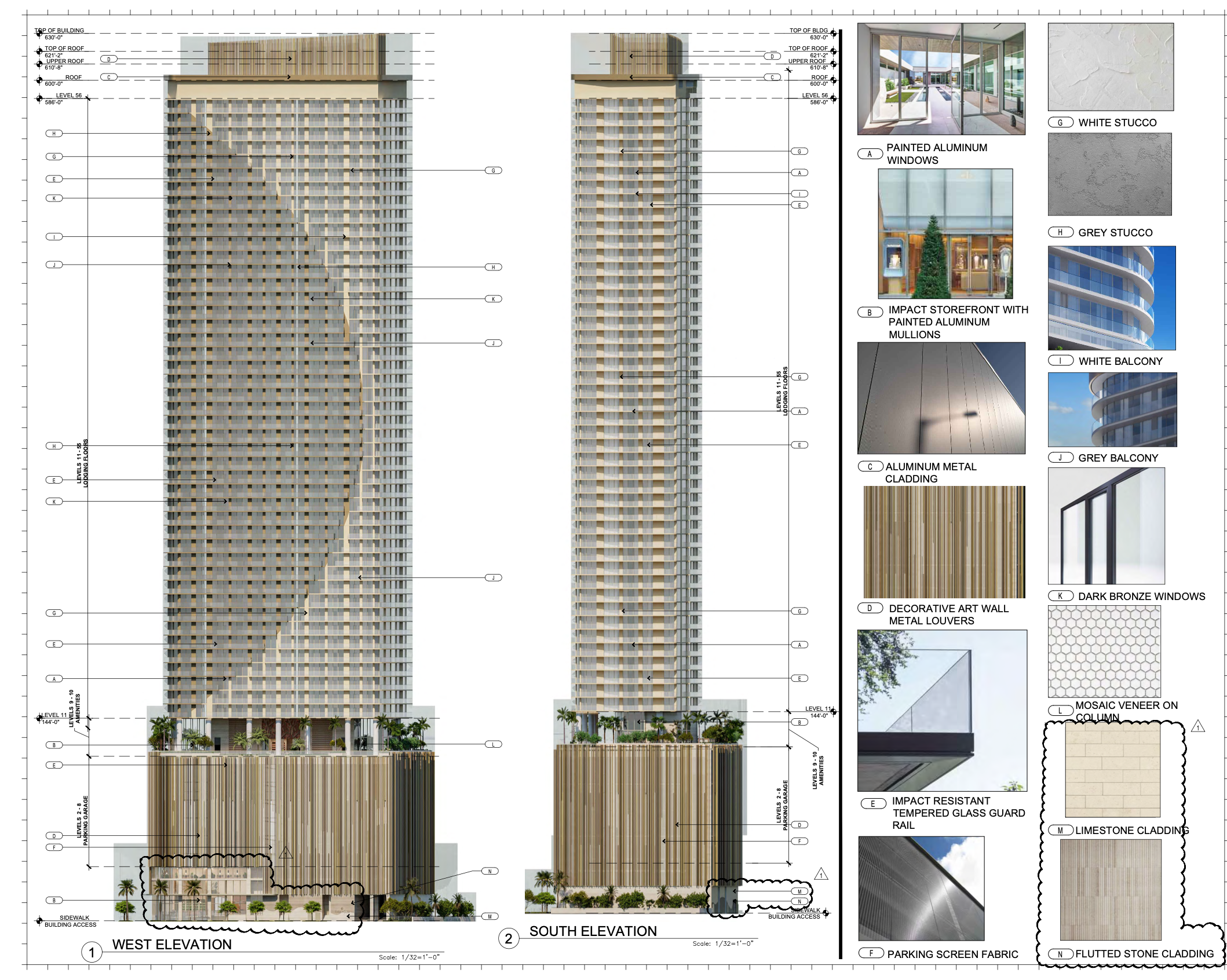 The material palette emphasizes light, reflective surfaces balanced with warmer tones at the podium. Painted aluminum windows and dark bronze framing pair with white and grey stucco finishes, while balconies alternate between white and grey for added texture. At the tower’s base, the podium is clad with aluminum metal panels and fluted limestone, with decorative metal louvers layered over portions of the garage. Additional detailing includes mosaic veneer on columns, tempered glass guard rails, and impact storefront systems with aluminum mullions at the ground level. Together, these finishes elevate the garage levels into a deliberate design feature, while maintaining a cohesive architectural language from street to crown.
