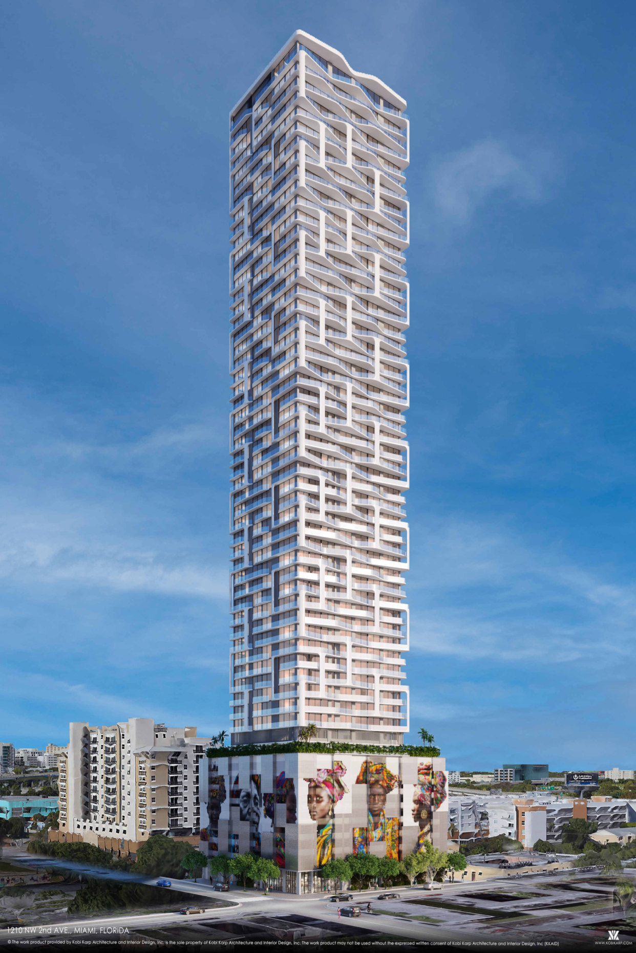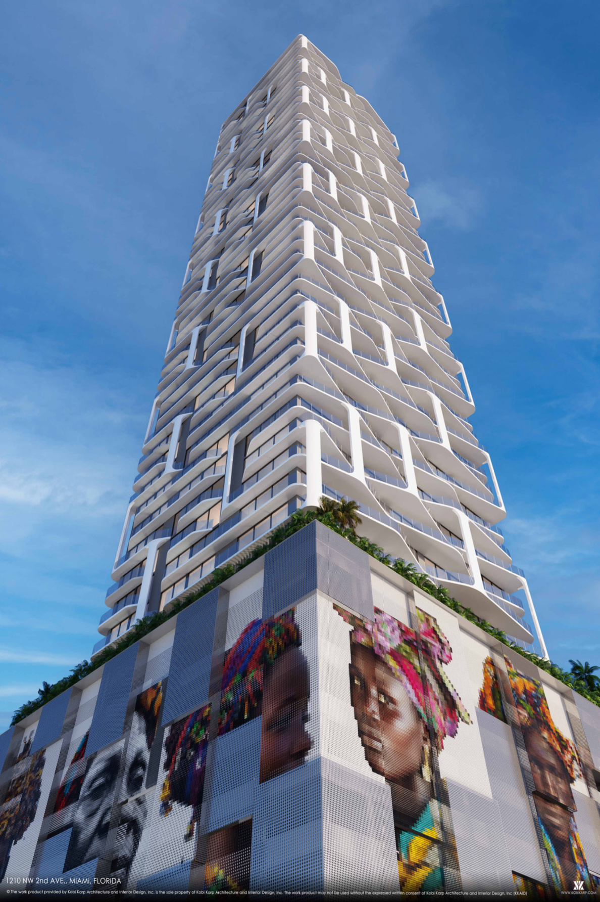 The eight-story podium presents a notable visual departure from the tower above. Rather than continuing the same design language, it adopts its own architectural identity through large-scale public art by Miami-based artist Yana Volf, celebrating the “brilliance and resilience of Black history and culture.” The façade features perforated metal panels in light and dark gray finishes, serving as a backdrop for Volf’s pixelated portraits of local residents. The base also includes streetscape enhancements, such as widened sidewalks, landscaping, and lighting improvements, along NW 2nd Avenue and NW 12th Street.