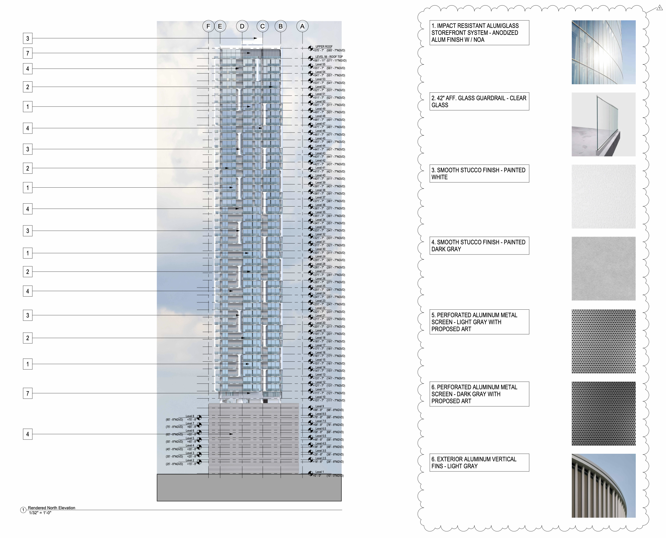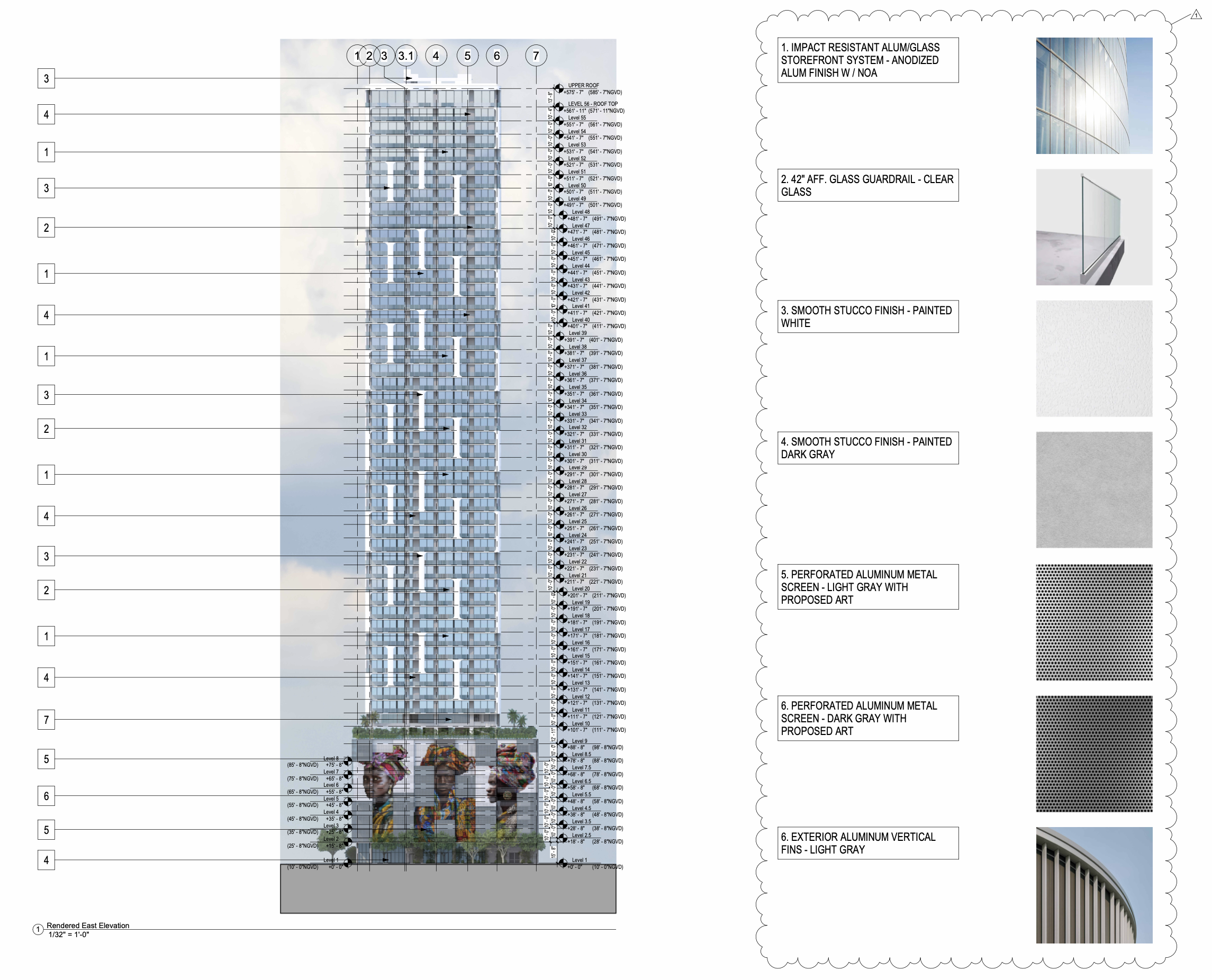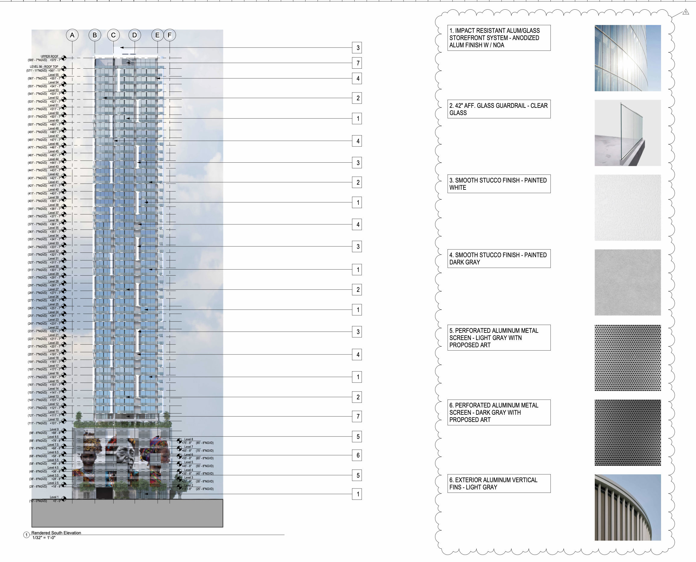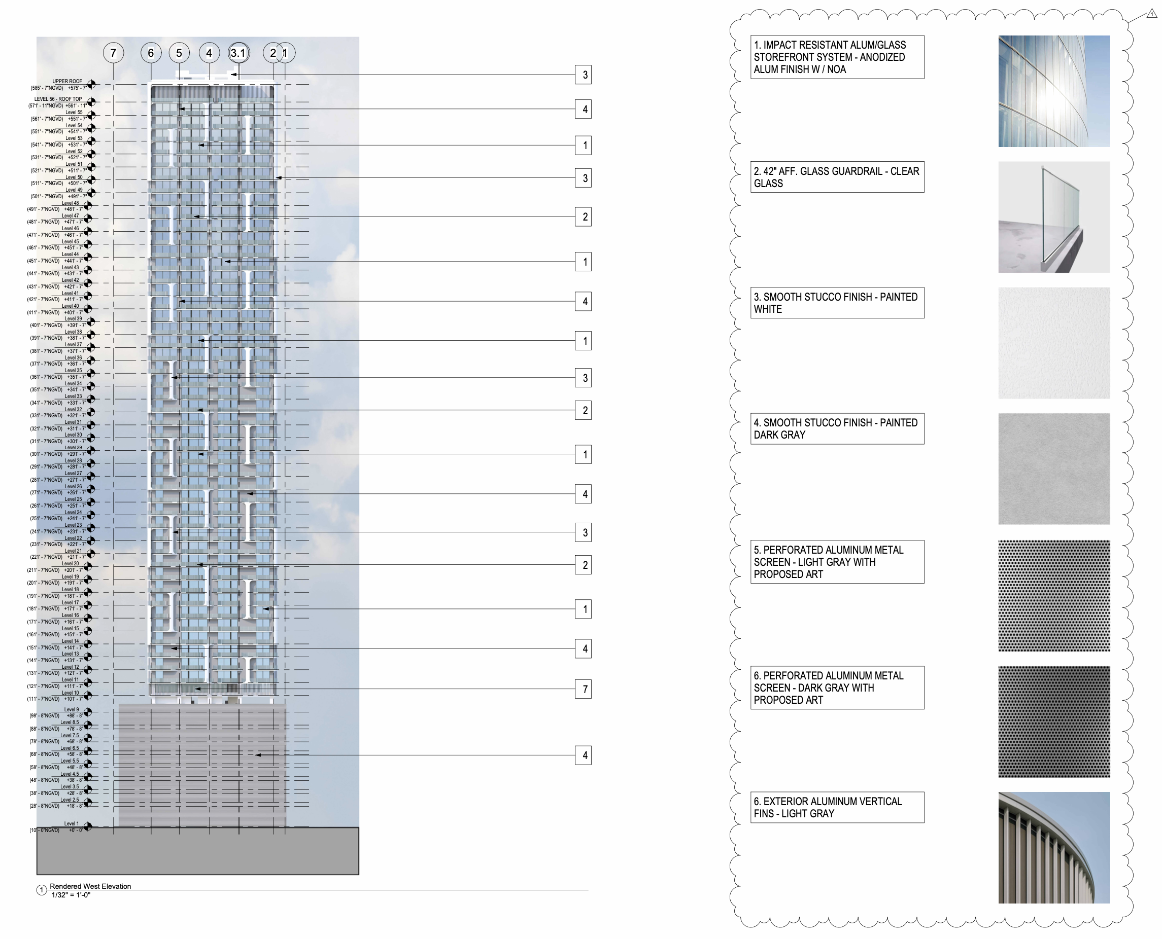Below are elevation drawings accompanied by material boards illustrating the expected exterior finishes for the tower. The materials reflect those commonly used in contemporary high-rise construction, including anodized aluminum and glass storefront systems, clear glass balcony railings, and smooth stucco surfaces painted in white and dark gray. The podium is expected to incorporate perforated aluminum panels in light and dark gray with integrated artwork, establishing a distinct visual break from the tower above rather than a complementary continuation.