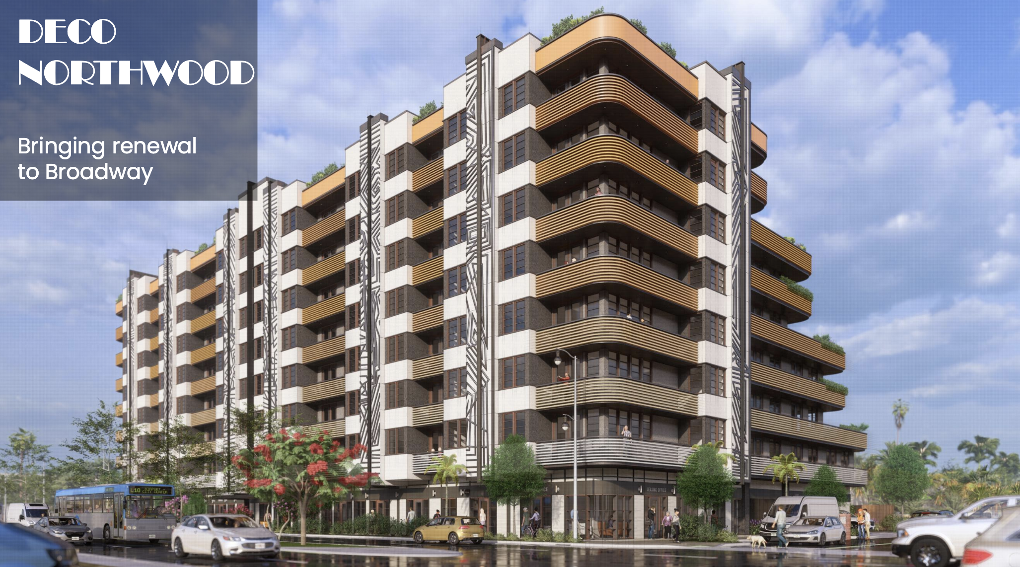 Deco Northwood gets its name from its architectural style: art deco. The Prime Company is the developer; it’s working with in-house Prime Design on the style and architectural renderings.
