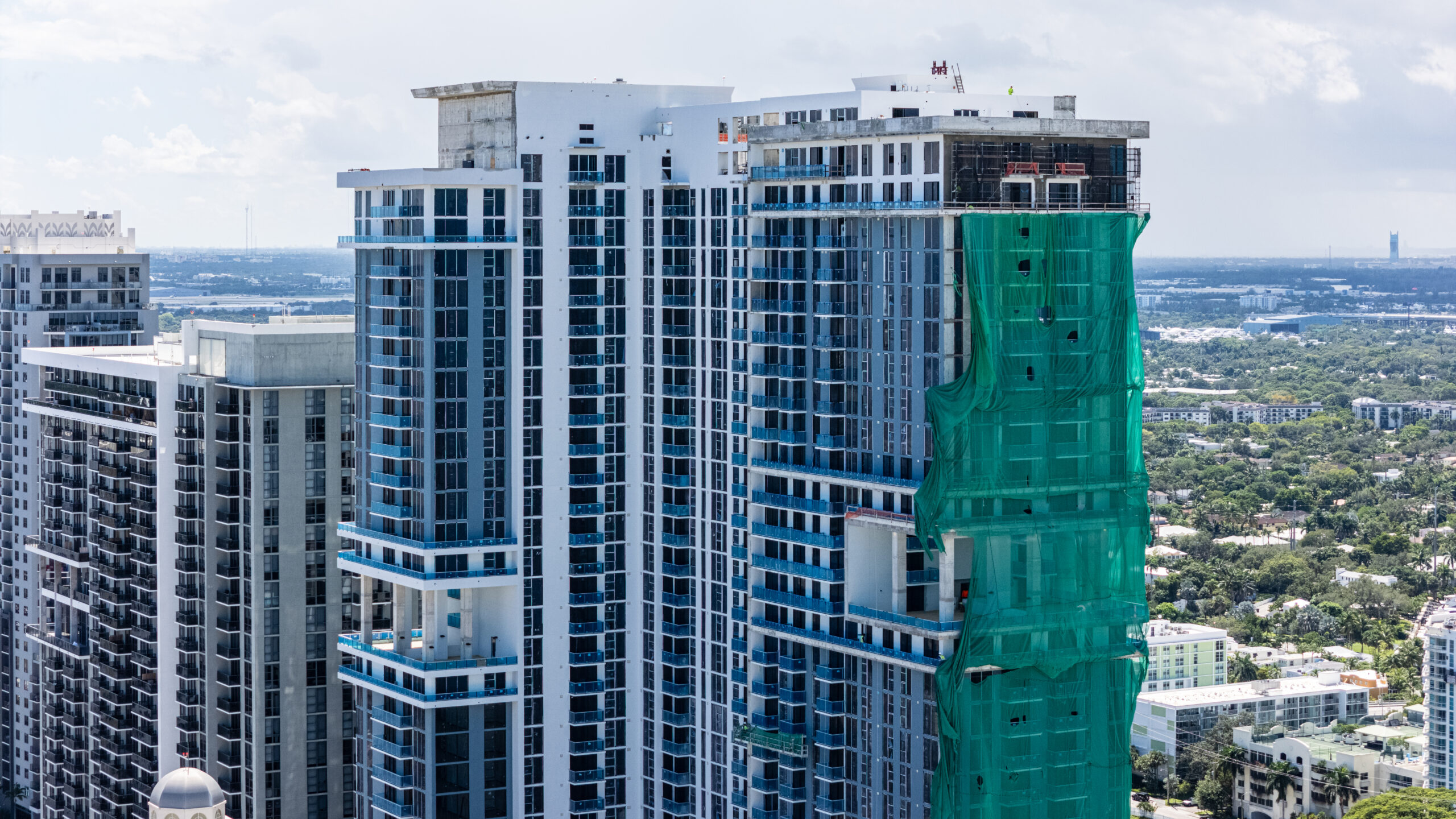 Recent aerial photographs show progress on the tower’s exterior, with white and gray painted stucco finishes now visible across much of the elevations and window systems largely in place. Installation of glass balcony railings appears nearly complete. Based on the photos, it appears these scopes are on track to wrap up in the coming months.