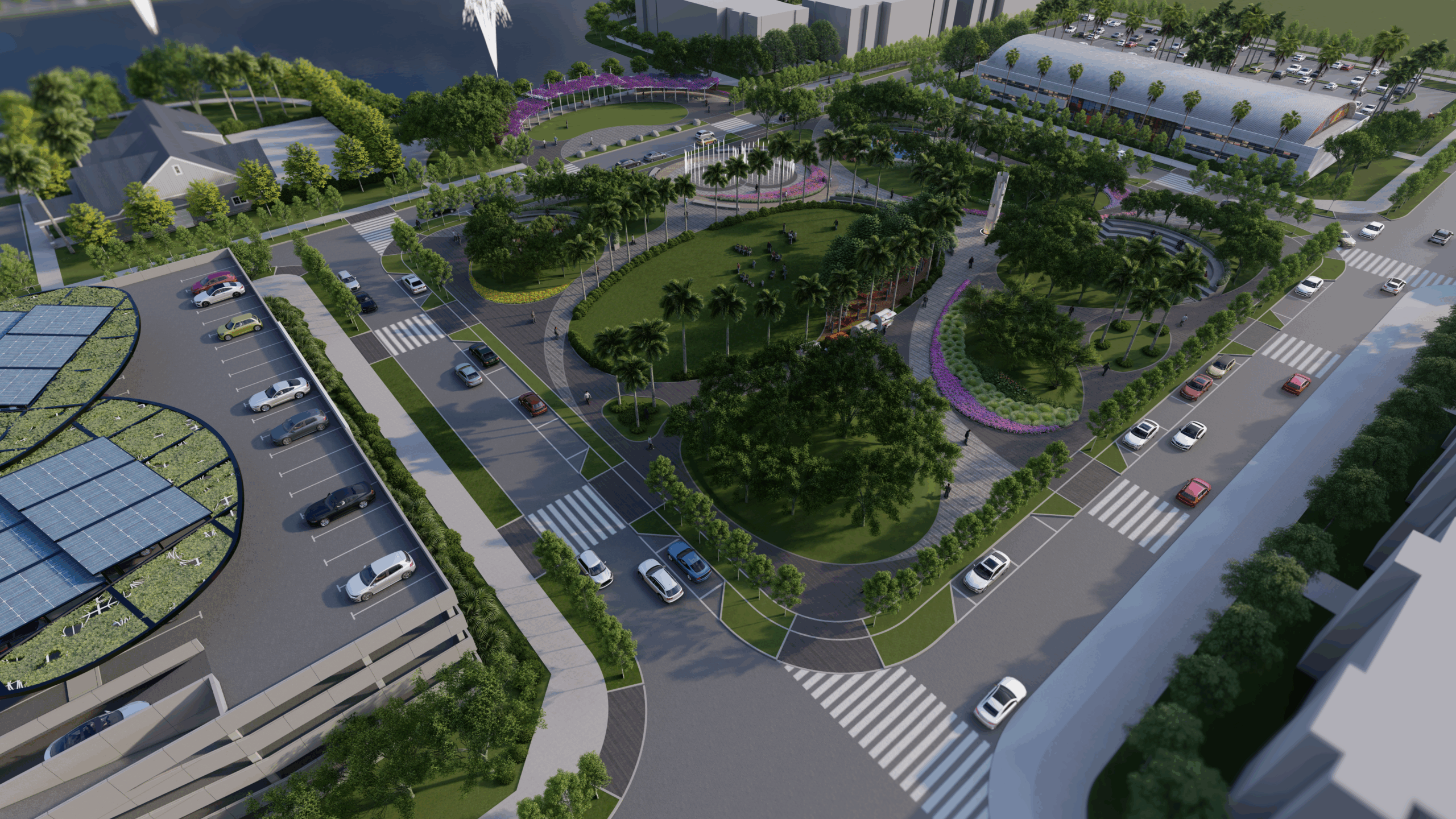 Where are the bike lanes??? The parking garage dominating the plan is awful. Do they need all of that parking for a park and a few stores? And, can’t it be better integrated into the site? So much for a ‘walking’ community. I appreciate a planned community, but this only looks like a park surrounded by housing and a few stores and a giant parking garage.
