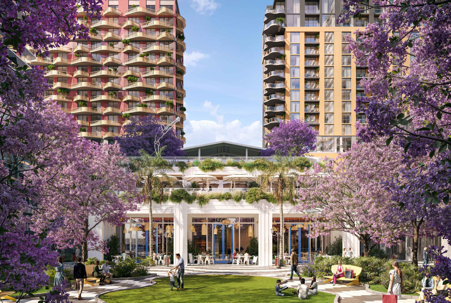 Landscape design is being led by Naturalficial, which has envisioned a multi-level green framework that integrates art, nature, and pedestrian experience. From the ground level to the upper terraces, the landscape ascends vertically, forming a living tapestry visible from the surrounding streets. Public art will play a prominent role in the development, with installations by Hernán Marina and Mariana Calezado incorporated into the plazas and lobby interiors. The residential lobby, designed by Meyer Davis Studio, will act as a gallery space with one hundred linear feet of transparent glass frontage, allowing art displays to remain visible from the surrounding sidewalks and park areas.