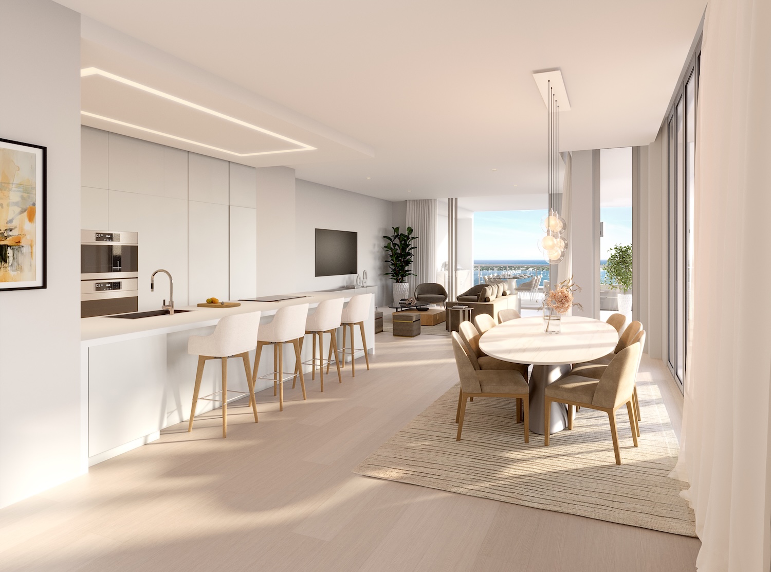 Alba Palm Beach offers over 25,000 square feet of amenity space. Programming includes a private dining room with temperature controlled wine storage, a fitness center equipped with Technogym equipment and a Pilates reformer, and a range of lifestyle partnerships available exclusively to residents.