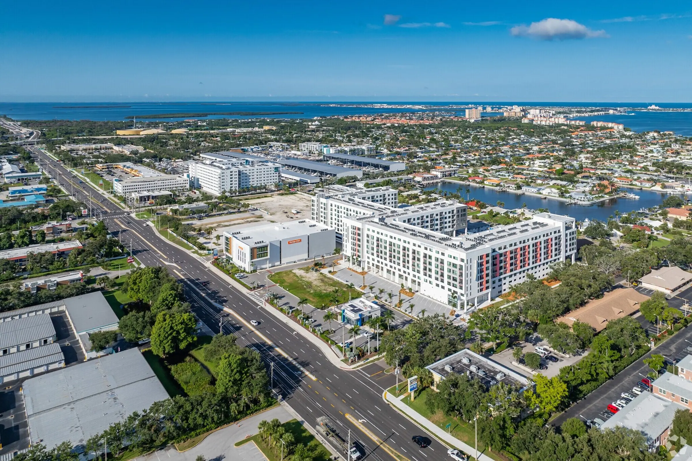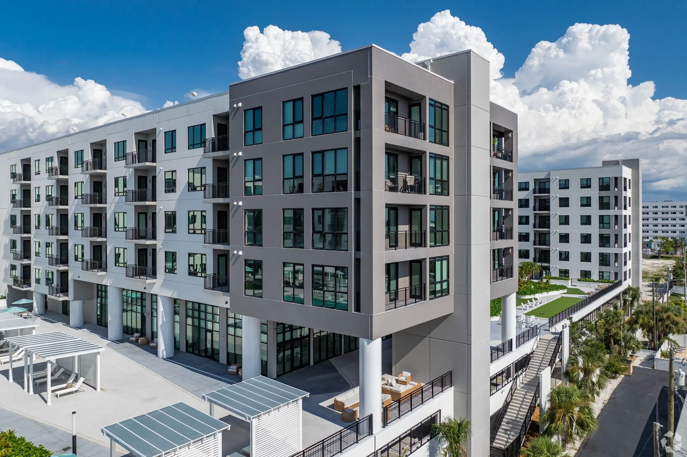 The development comprises studio, one, two, and three-bedroom apartments ranging from 500 to 1,200 square feet. The property sits overlooking Boca Ciega Bay and offers views toward the downtown St. Petersburg skyline.