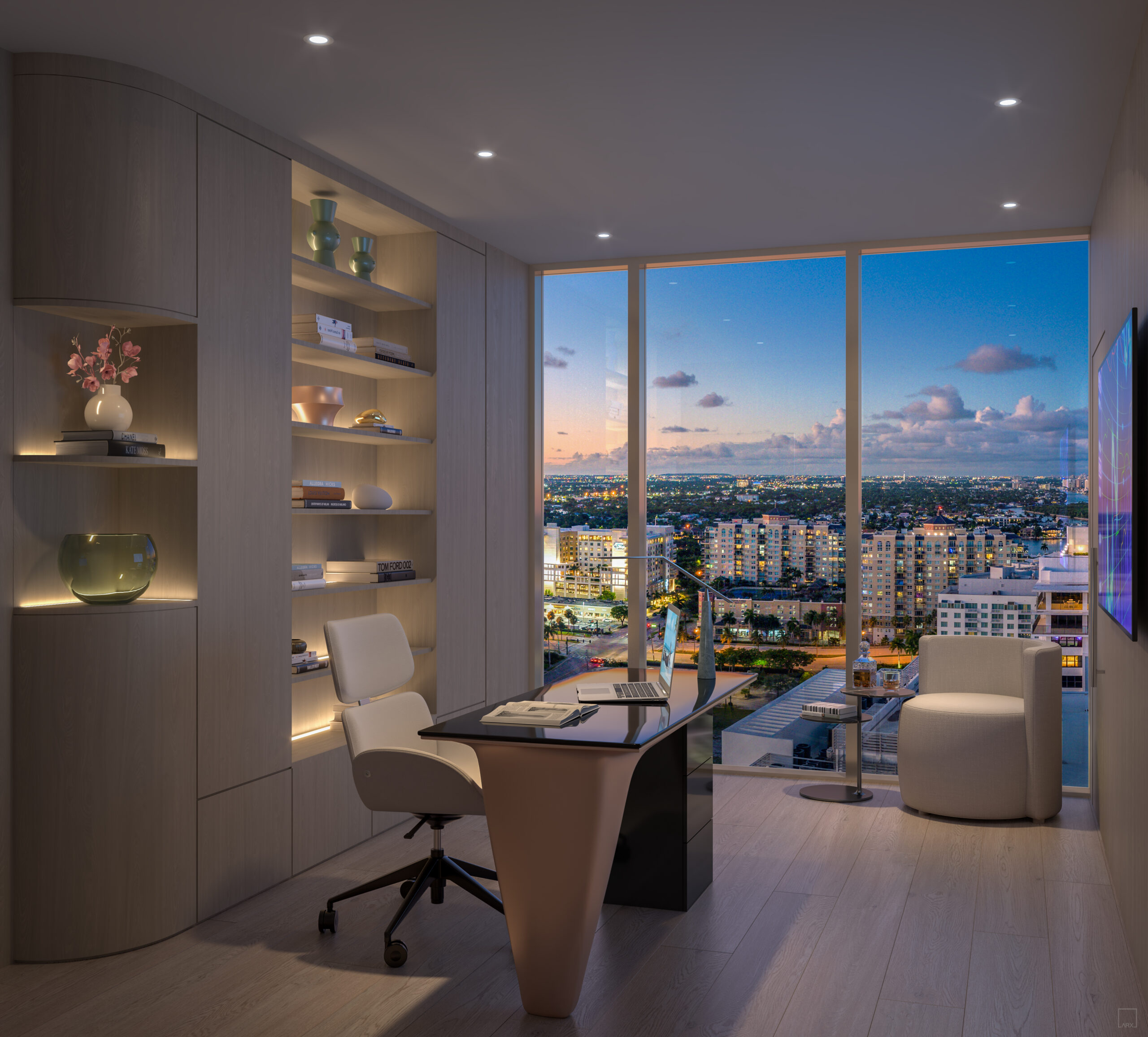 The collection of three and four bedroom residences will begin at 2,767 square feet, each oriented for unobstructed views of the Intracoastal Waterway and the Atlantic Ocean, protected in perpetuity by the Bonnet House Museum and Gardens. Homes will feature ten foot ceiling heights, Italian kitchen cabinetry custom designed by BAMO, floor to ceiling impact resistant glazing, expansive private terraces with summer kitchens and clear glass railings, custom Italian entry and interior doors, smart home systems, high end appliances, and midnight bars in primary bedrooms. The Sage Penthouse Collection will offer increased ceiling heights as well as private rooftop spaces with summer kitchens and plunge pools.