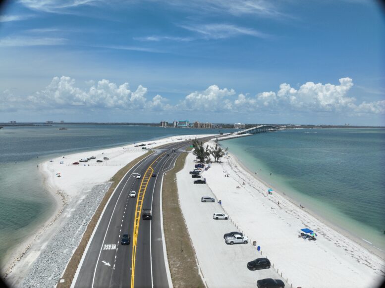 The rebuilt causeway incorporates steel sheet pile wall systems totaling nearly 750,000 square feet, elevated seawalls, advanced stormwater drainage infrastructure, and 127,996 tons of armor stone placed for shoreline protection. The design is engineered to withstand Category 5 hurricane conditions. Completed segments endured multiple storms during the 2024 hurricane season, including Hurricanes Debby, Helene and Milton, while areas still under construction required additional repairs.