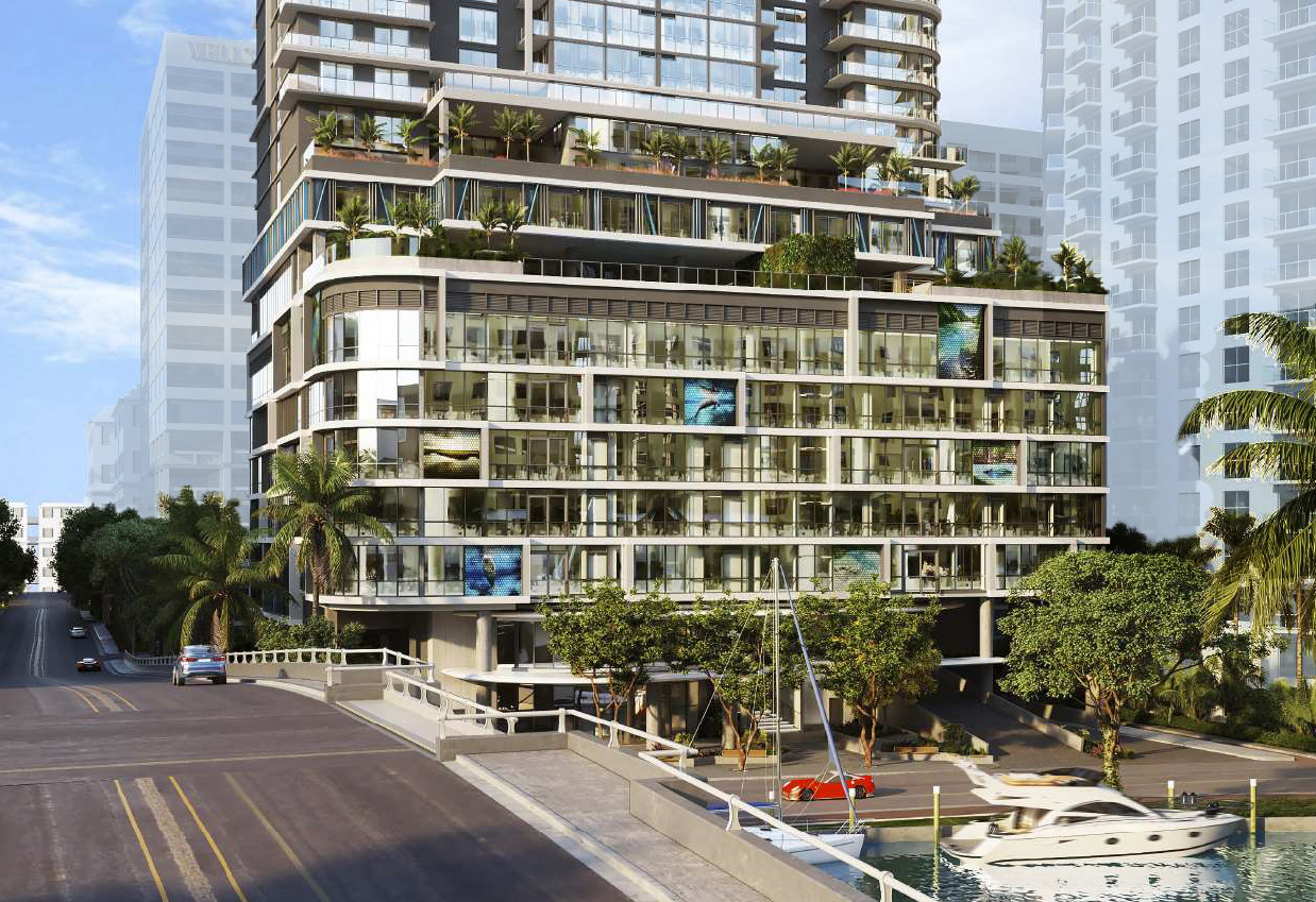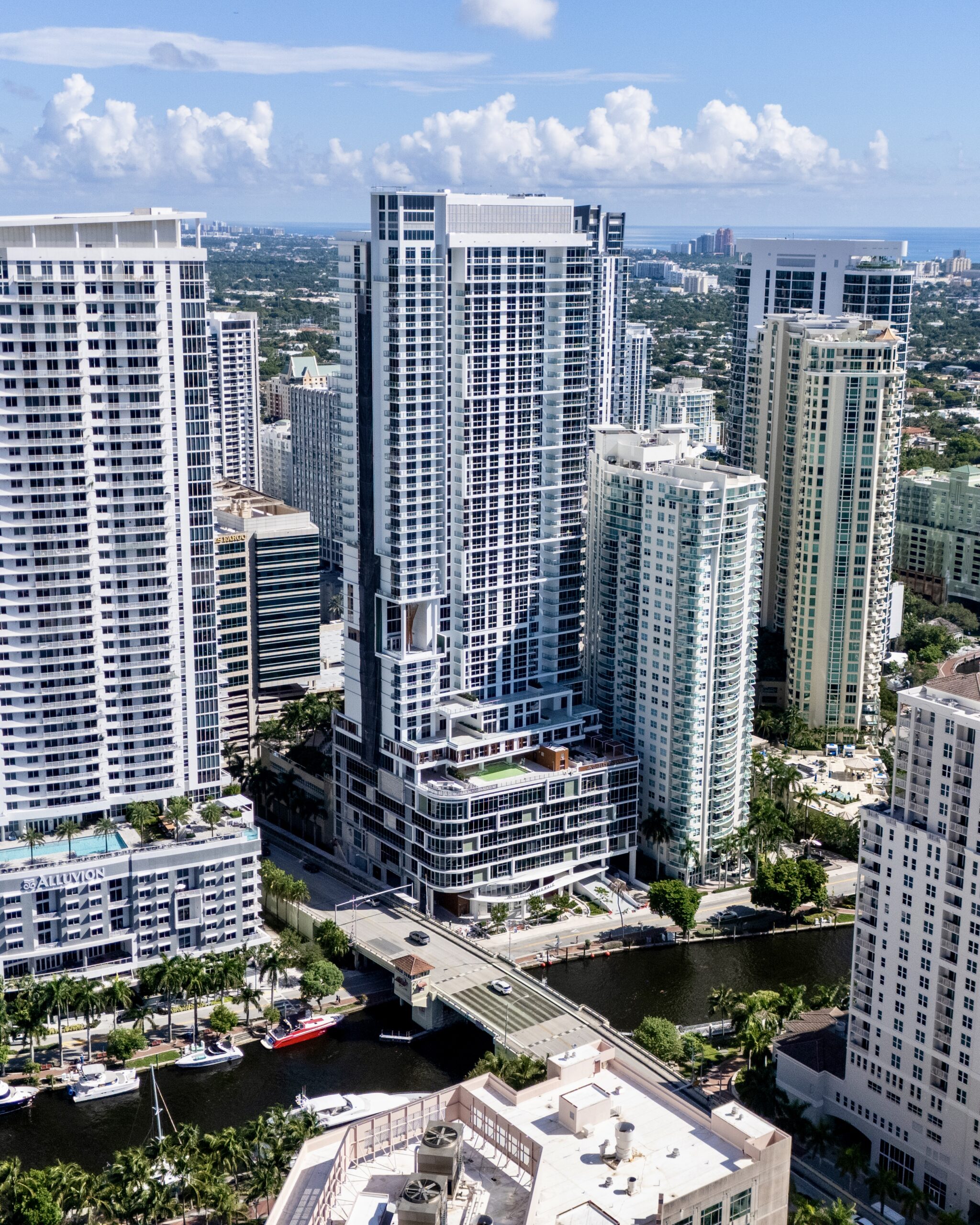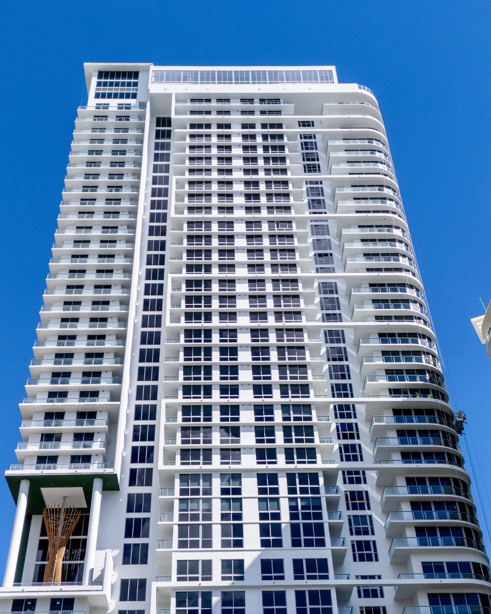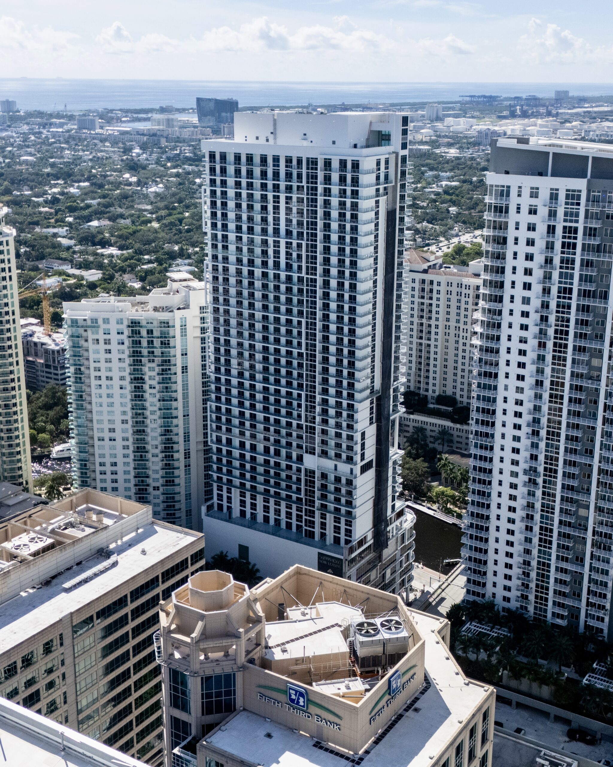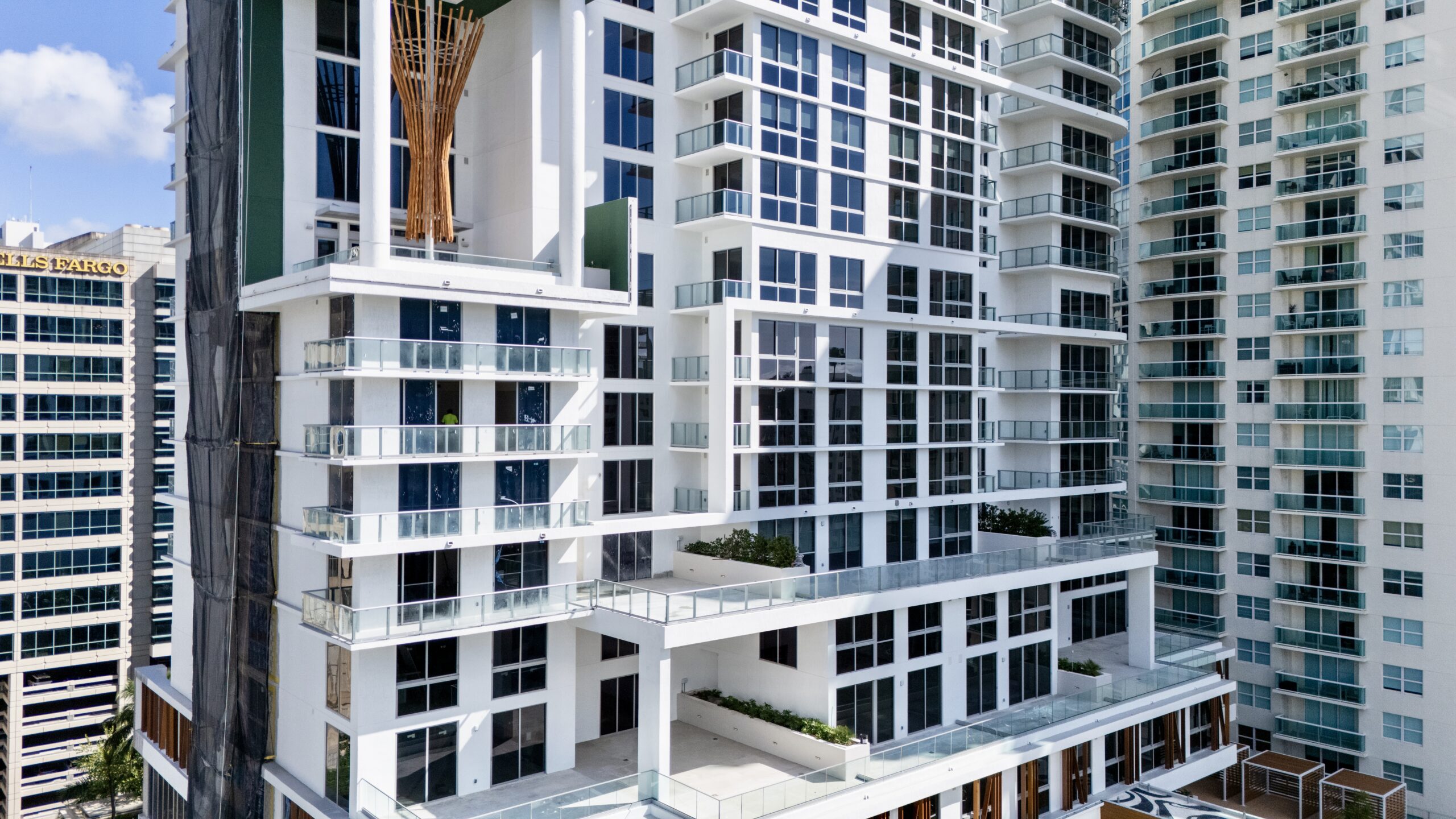 Aerial photos captured in late September show finishing touches being applied to the tower ahead of the announcement. The design follows a contemporary architectural style characteristic of Downtown Fort Lauderdale, featuring dark glazing, clear glass balcony railings, white stucco base treatments, and wood-like trims accenting the amenity levels. The window arrangement is largely repetitive across the elevations, with variations occurring where cutouts and setbacks articulate the tower’s massing.
