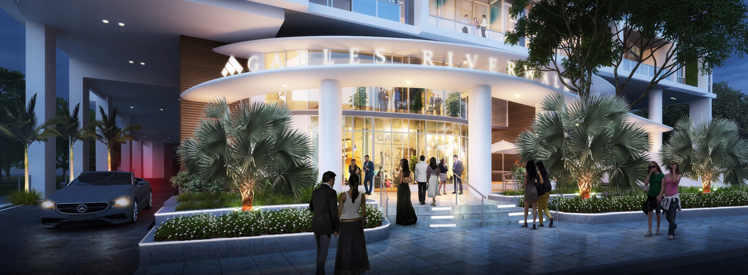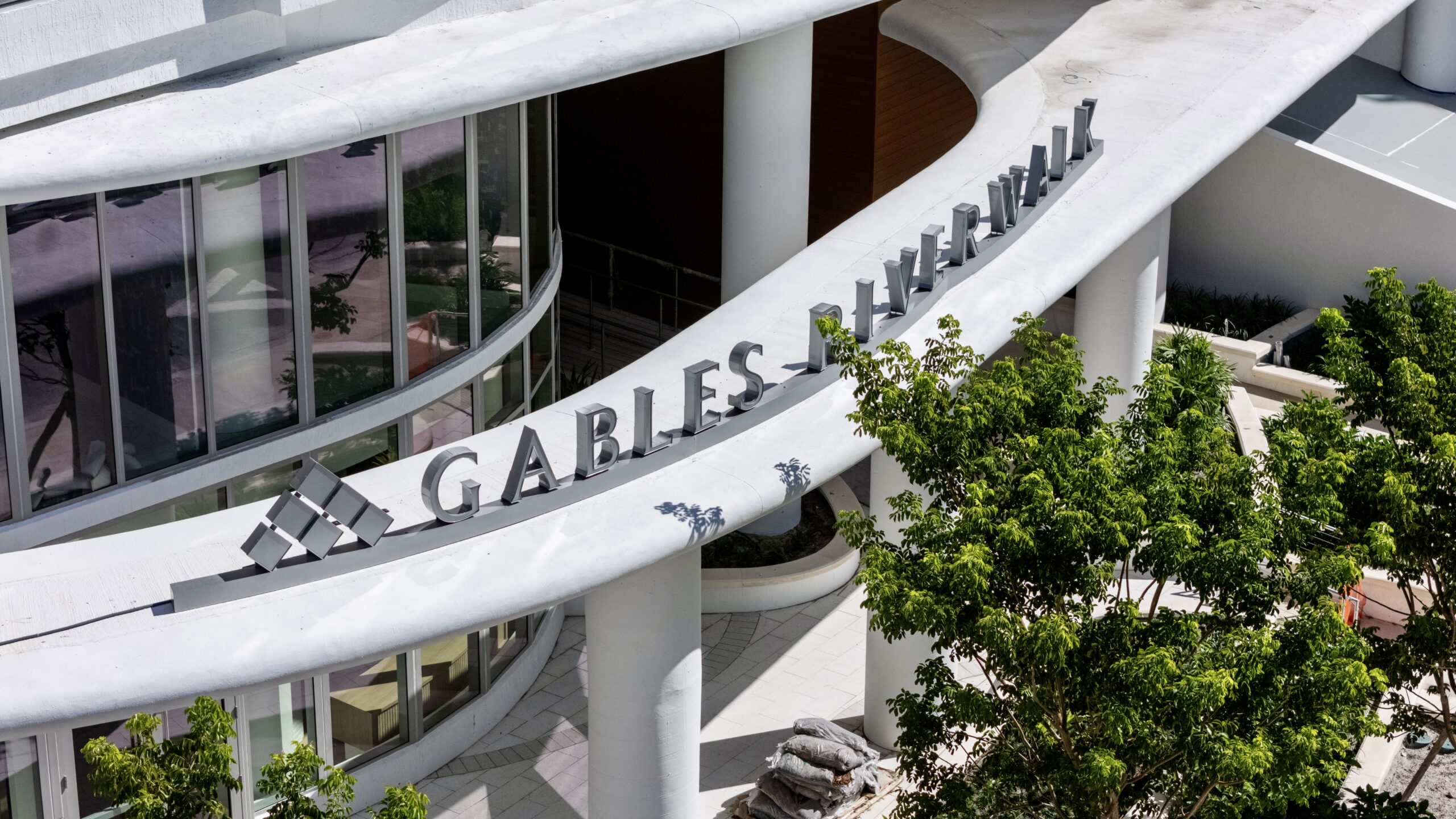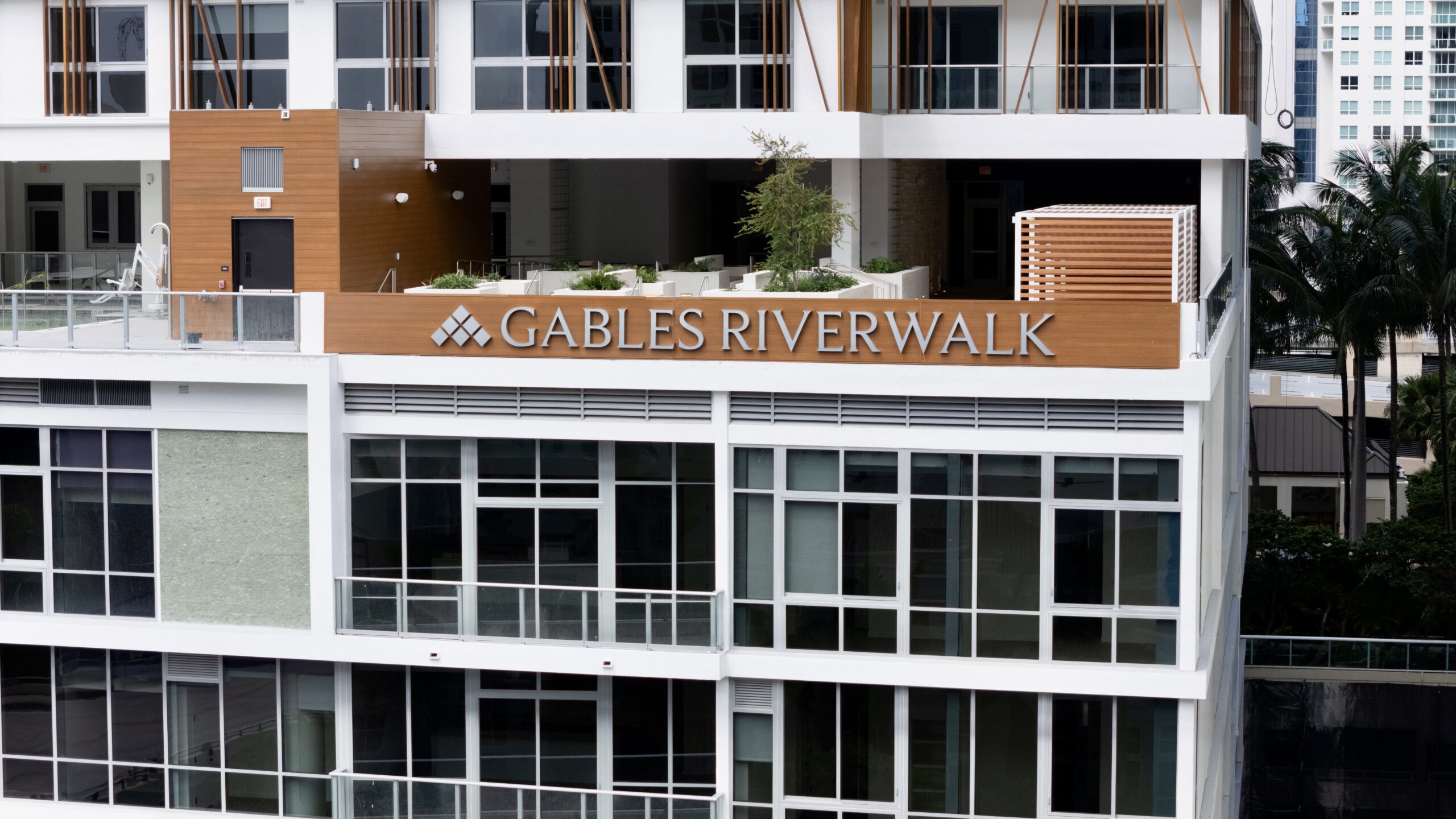 The following two images provide close-up views of the building’s metallic signage, with the Gables Riverwalk name installed over wood paneling along the podium roofline and again above the ground-floor entry canopy.