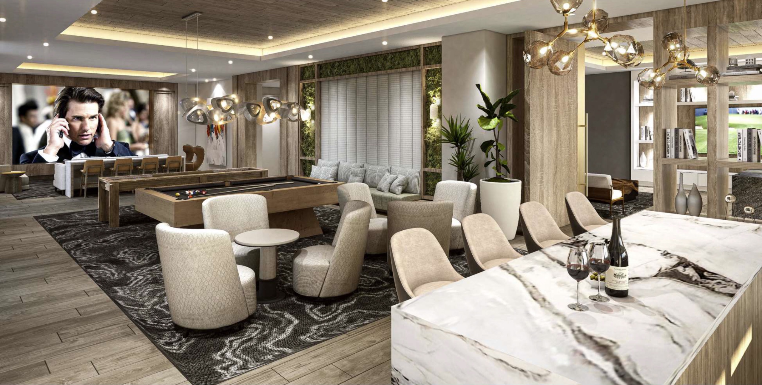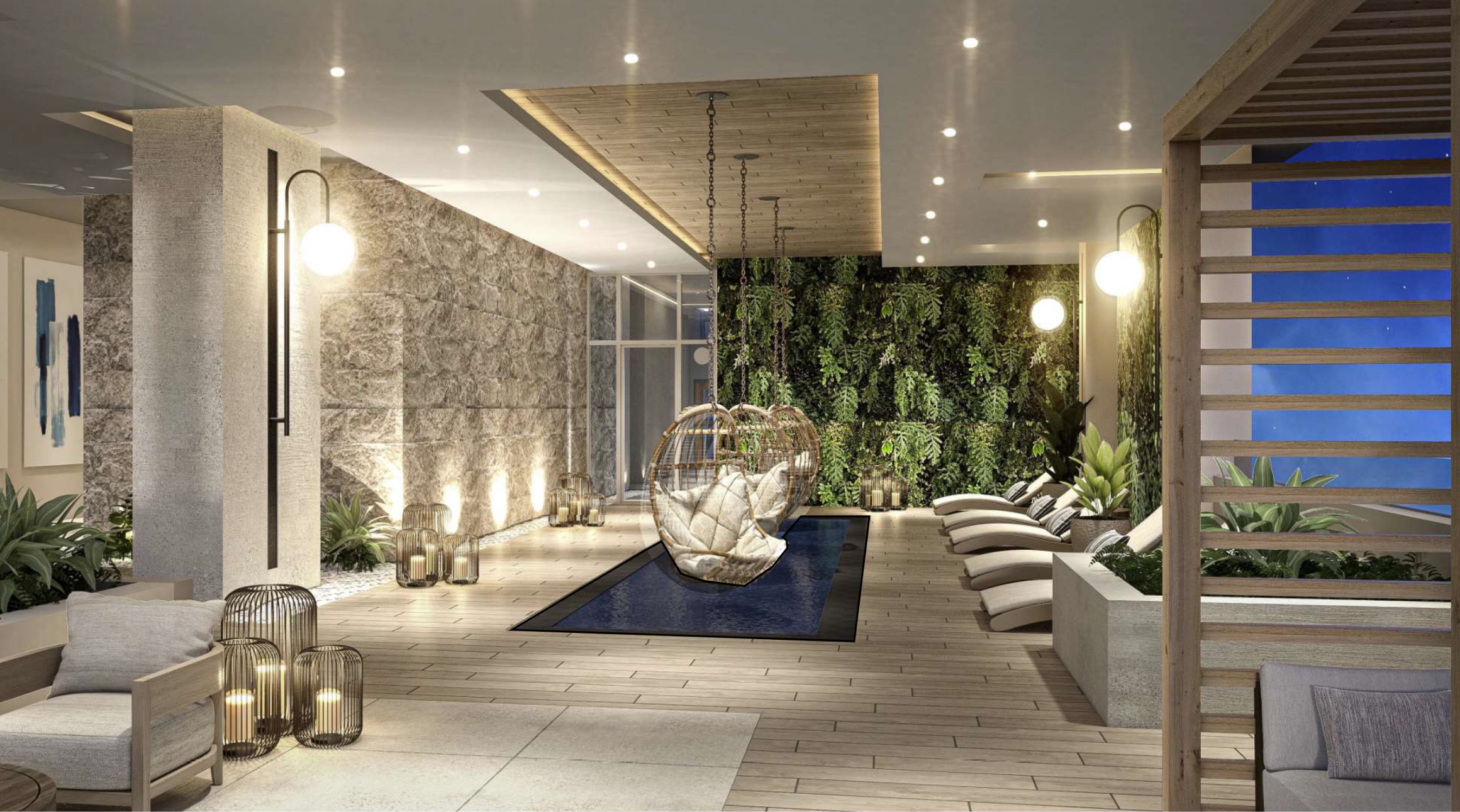 The seventh floor features a comprehensive collection of wellness and recreation spaces, including a yoga room, swing garden, spa lounge, treatment rooms, a salt room, infrared sauna, and outdoor spa. The same level also contains a resort-style pool deck with cabanas, a wet bar, media lounge, and landscaped lawns that serve as an outdoor movie theater. Additional amenities include a game room, club lounge, fitness and spin rooms, outdoor grilling stations, and Wi-Fi lounges.