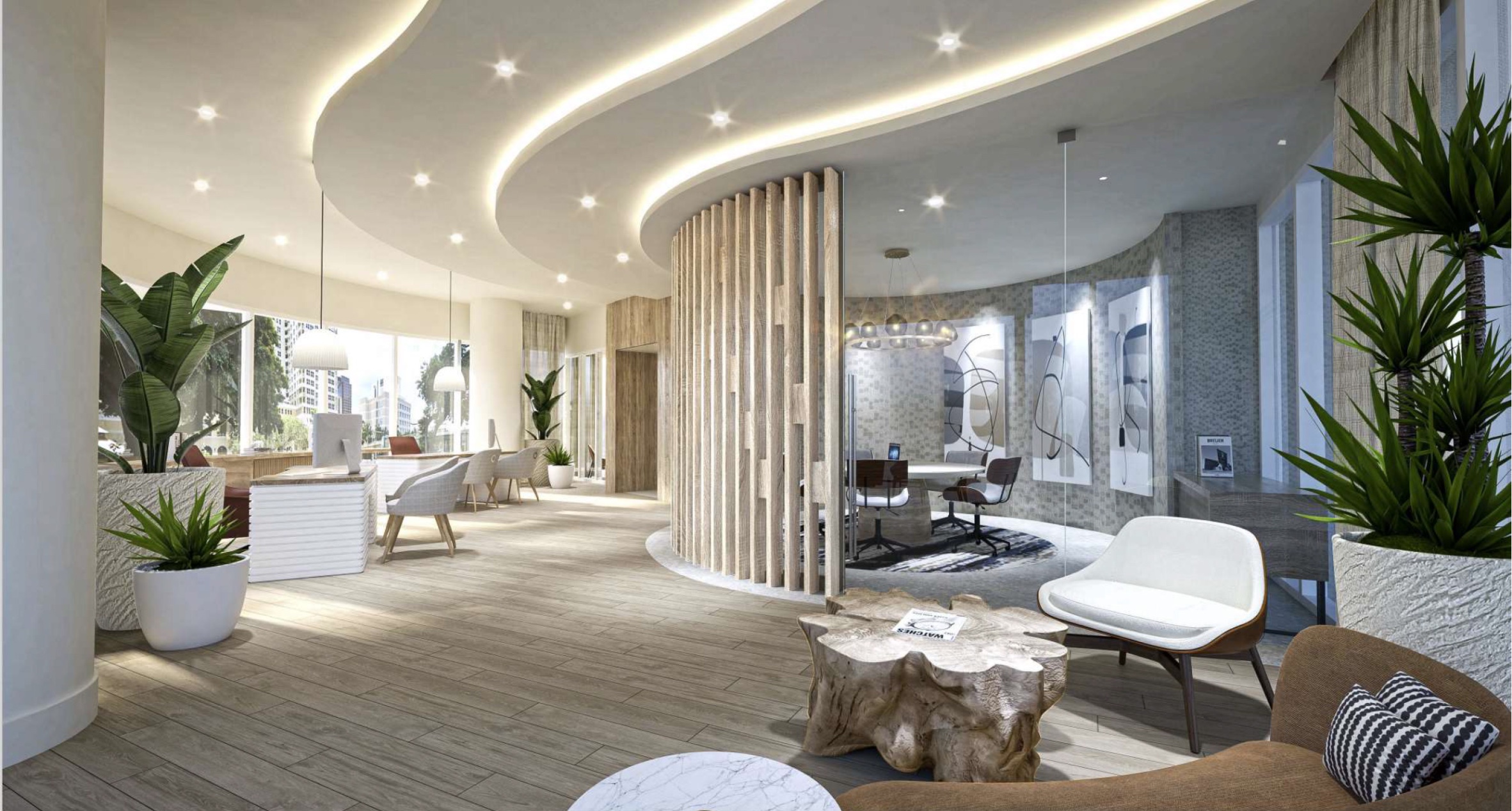 One-, two-, and three-bedroom units come in a variety of layouts and feature contemporary interiors designed for comfort and functionality. Each residence features high-end finishes, with layouts that emphasize natural light and open views of the Fort Lauderdale skyline and the New River. Ceiling heights reach up to 12 feet, and floor-to-ceiling windows enhance the sense of space. Smart home technology is integrated throughout. Select residences include glass pocket barn doors, and most offer private balconies or terraces.