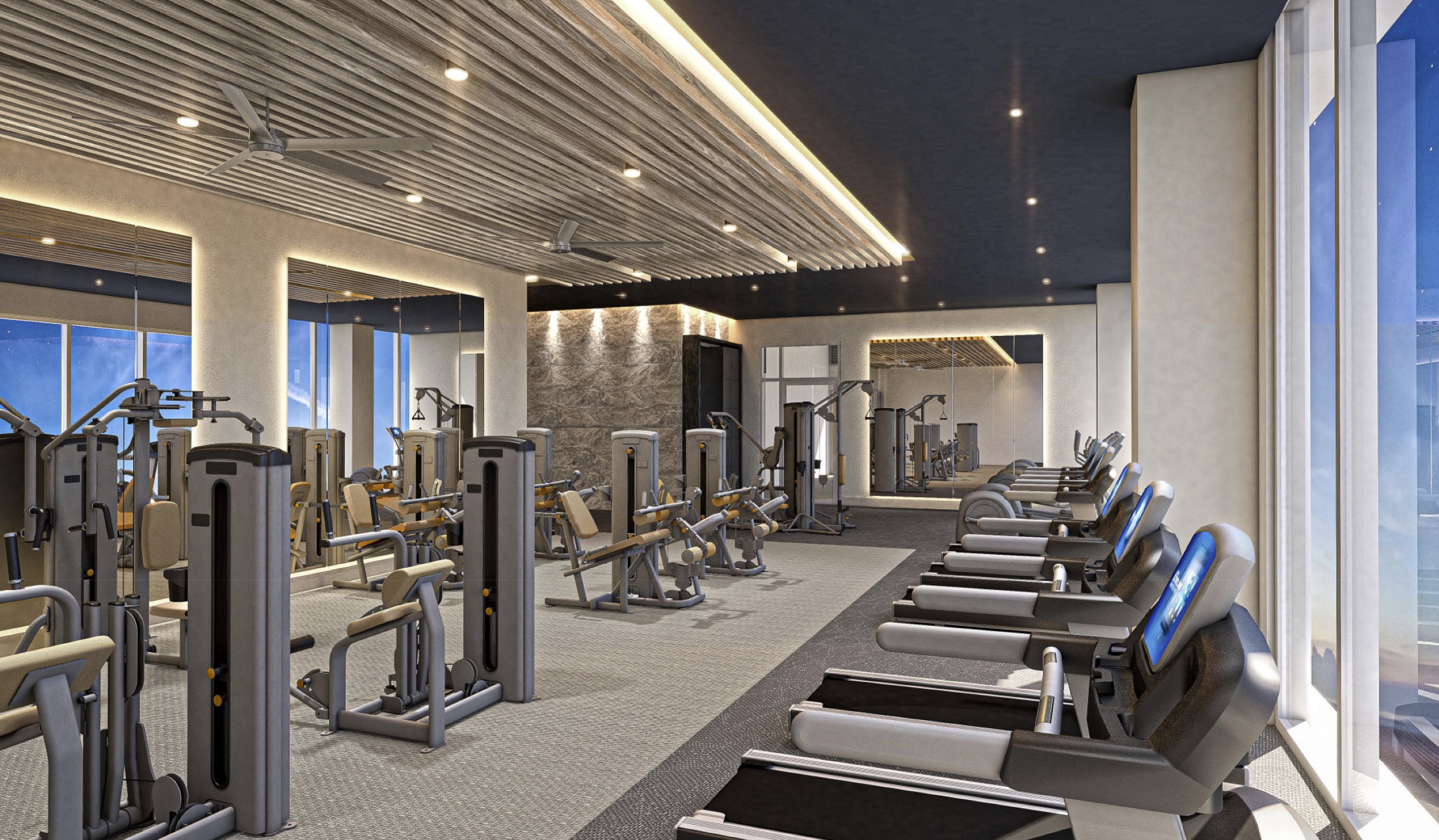 The building’s amenities are distributed across several floors and designed to support both leisure and productivity. The ground level and mezzanine include a double-height lobby with 24-hour concierge and valet service, a grab-and-go market, a dog wash, bike storage, and private offices with views of the New River. A conference room provides additional workspace for residents.