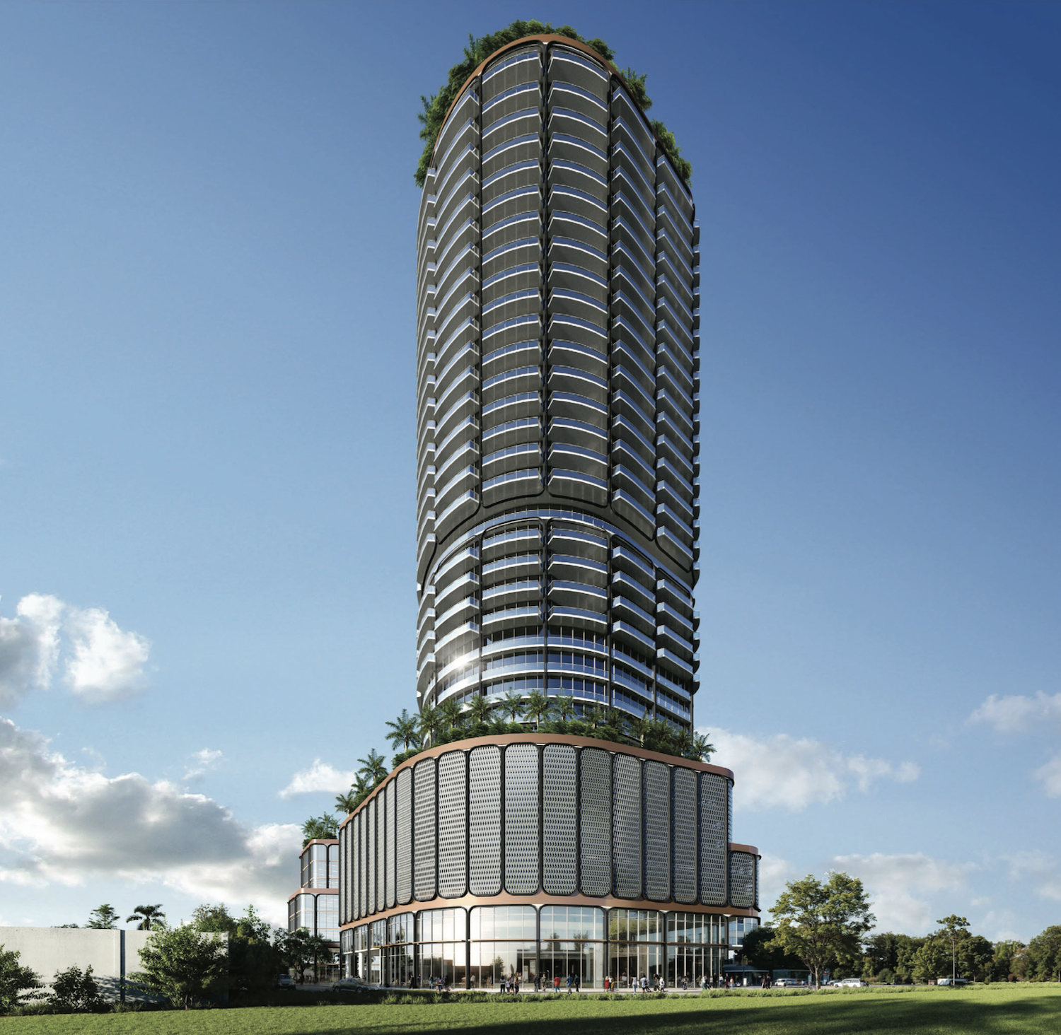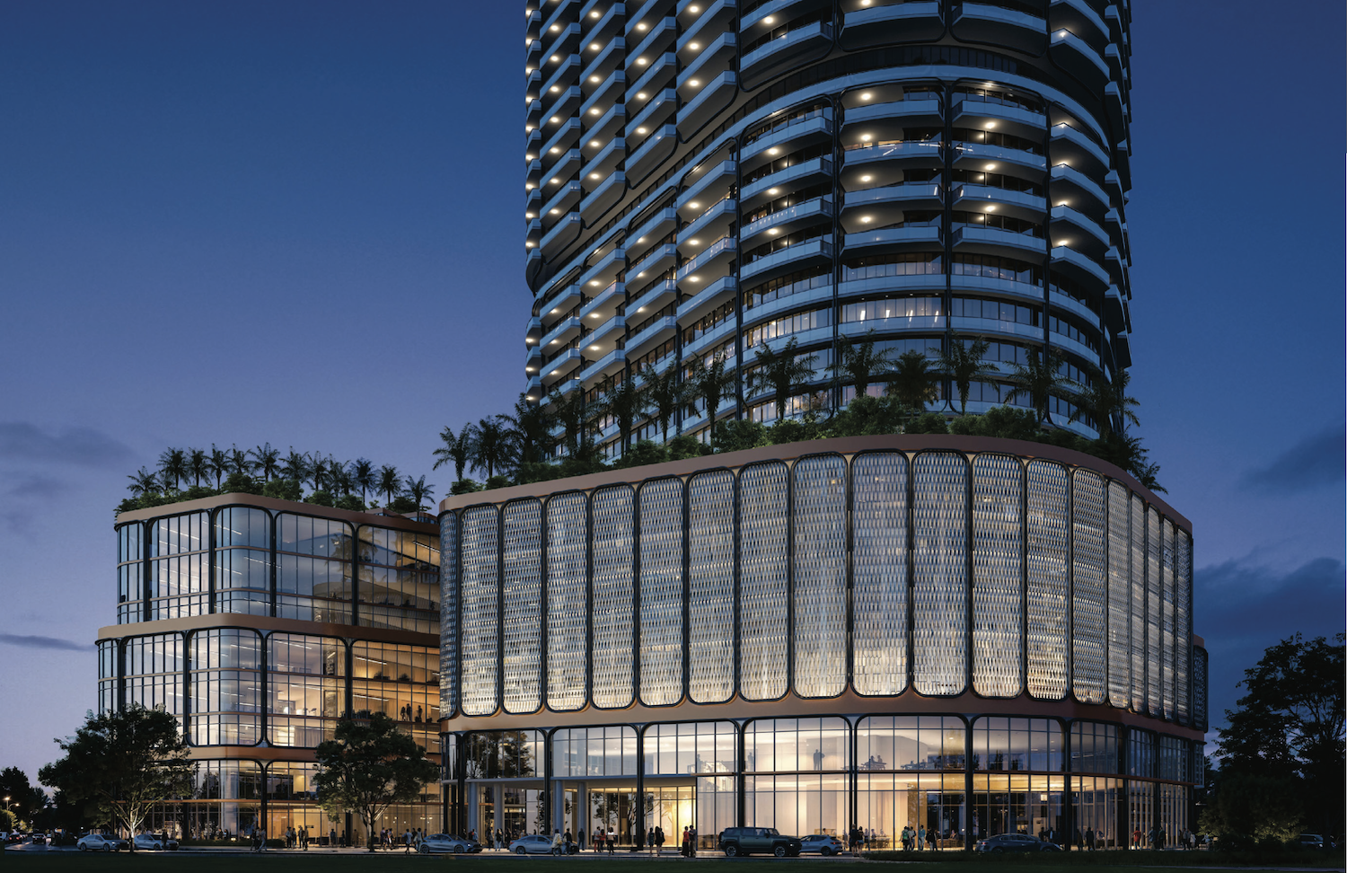 Above the podium, the tower rises as a distinct vertical element within the Design District skyline. The upper floors are articulated through slender vertical elements and curved facade edges that frame the building envelope and emphasize vertical proportion. These facade treatments establish a consistent upward rhythm while balancing structural expression with exterior articulation.
