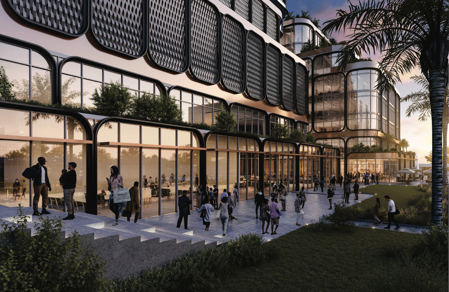 At the base, the project integrates commercial, office, amenity, and parking functions within a coordinated podium condition. Active ground-floor uses are oriented toward the public realm, with transparent frontage intended to engage the sidewalk and reinforce the district’s retail character. Curved building edges and floor-to-ceiling glazing are used along primary frontages to soften corners, enhance visibility into interior spaces, and establish continuity between interior programs and the street.