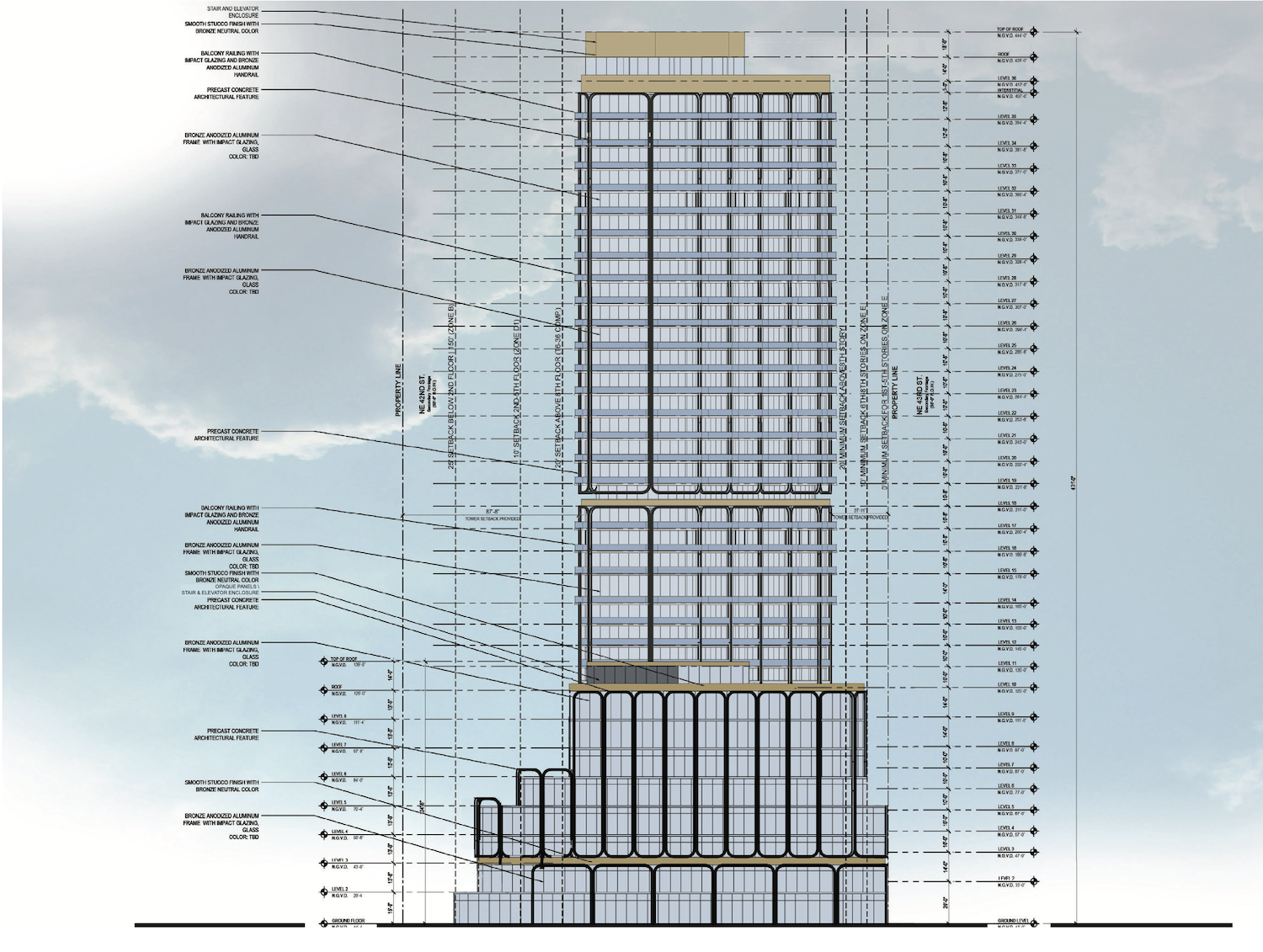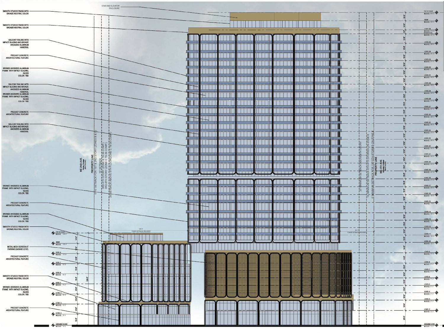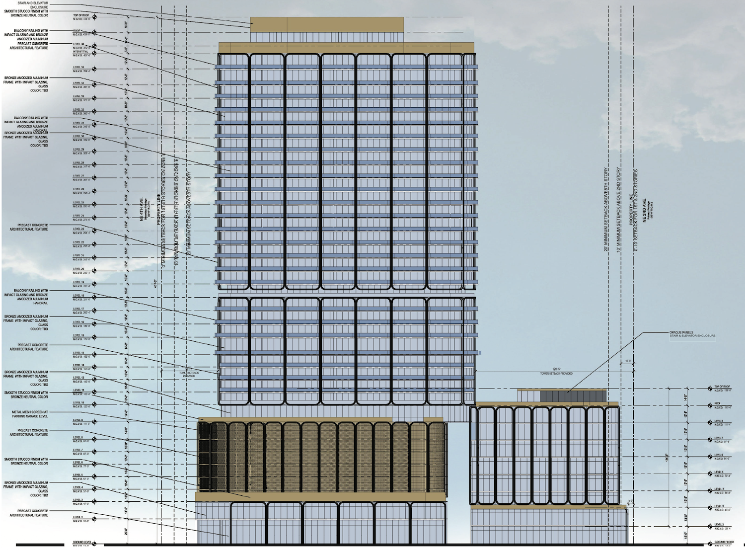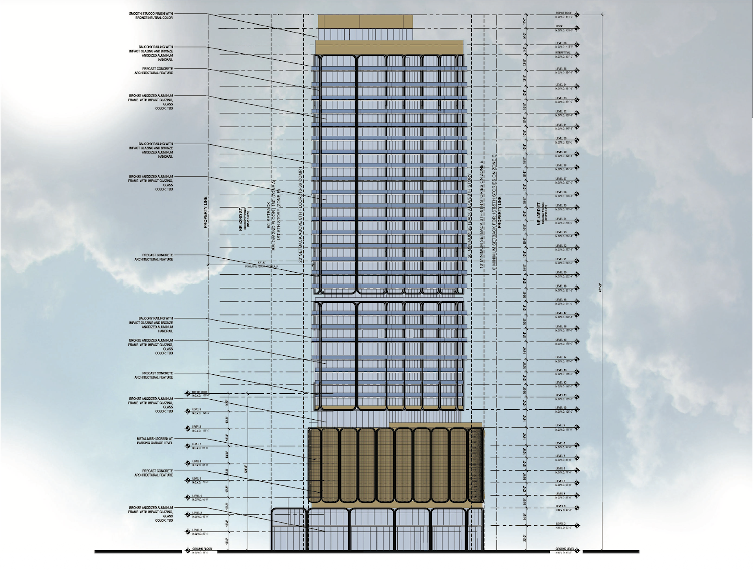 The eastern building is planned to rise 36 stories and reach approximately 412 feet to the main roof, for a total height of about 444 feet to the top of the roof. The western building is designed as an eight-story structure rising approximately 125 feet to the main roof, or 139 feet to the top of the roof. The development will be supported by 613 parking spaces, provided through a single underground parking level and structured parking within the eastern building. Vehicular access is proposed from Northeast 4th Avenue.