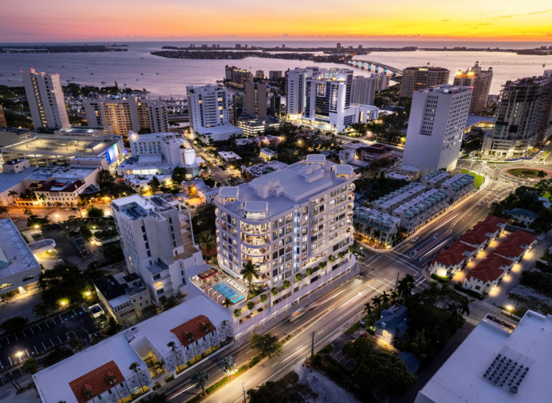 The project site occupies a prominent downtown corner at Cocoanut Avenue and Fruitville Road, placing the building within walking distance of Sarasota’s central business district and cultural institutions.