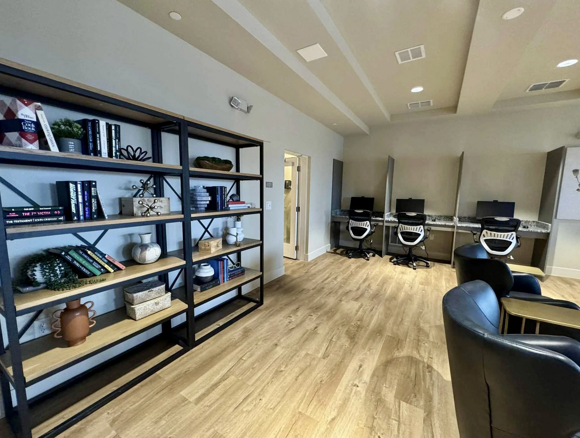 The three-story Heritage Oaks offers a variety of communal amenities, including a fitness center, computer lab, and small dog park. Other offerings include a billiards room, laundry facilities, and community center. A future phase will feature a pickleball court. There are also 70 surface-level parking spots.