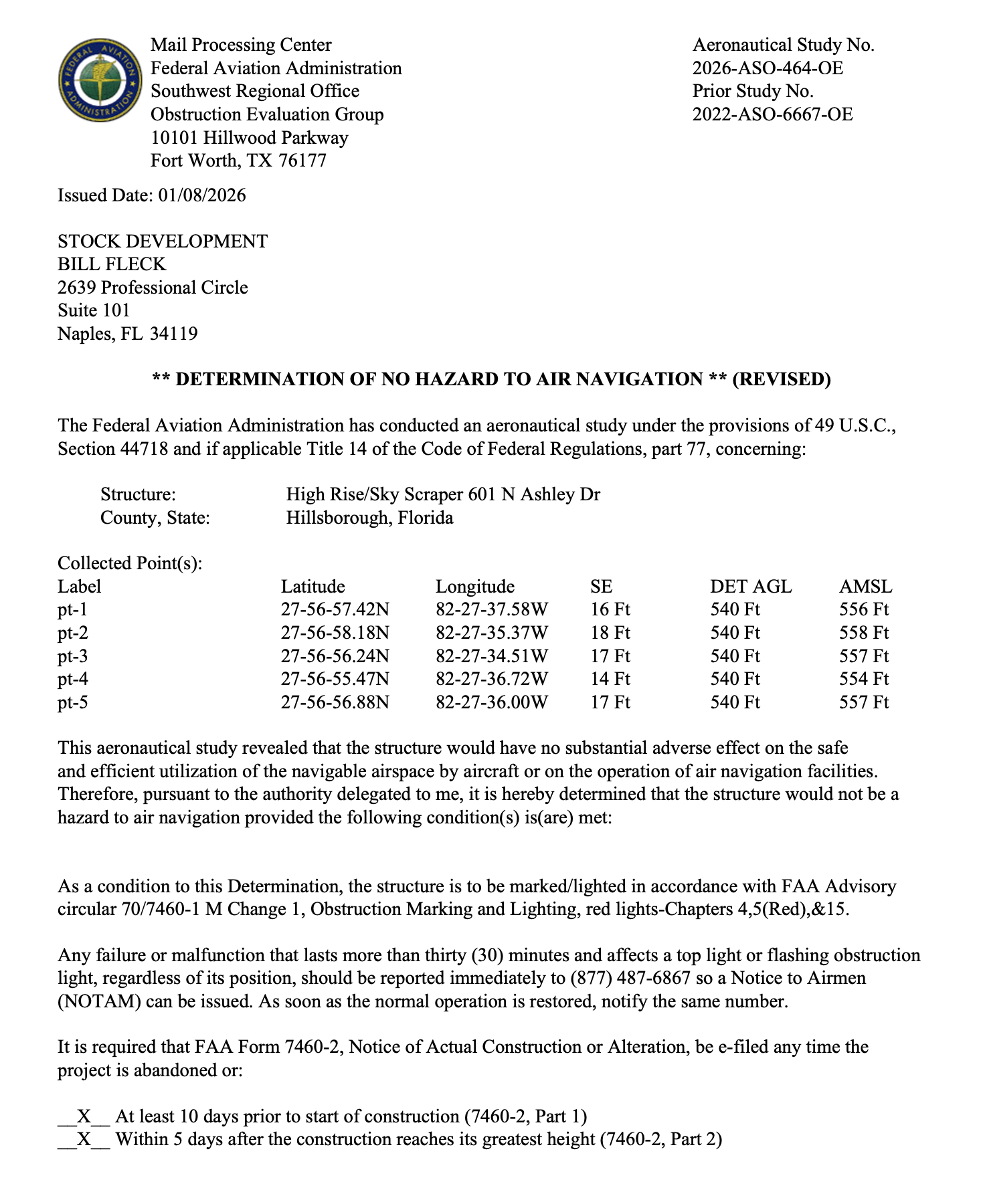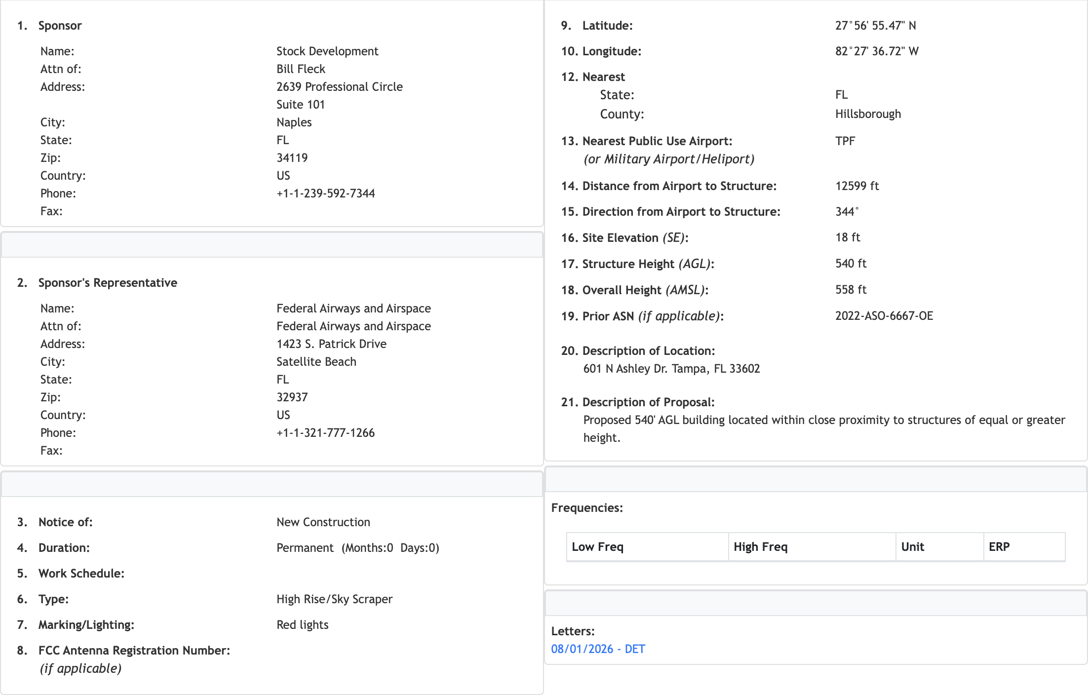 The Federal Aviation Administration has reissued permits for a proposed high-rise redevelopment at 601 N. Ashley Drive in downtown Tampa, confirming that the project’s approved height envelope remains unchanged after a change in ownership. On January 8, 2026, Bill Fleck of Stock Development refiled FAA permits for the site, covering a structure rising 540 feet above ground level, or 558 feet above mean sea level. The application received an immediate Determination of No Hazard to Air Navigation, issued the same day. According to project sources, the reapplication was required solely due to a change in sponsor following Stock Development’s acquisition of the property and did not reflect any modification to the previously reviewed height envelope.