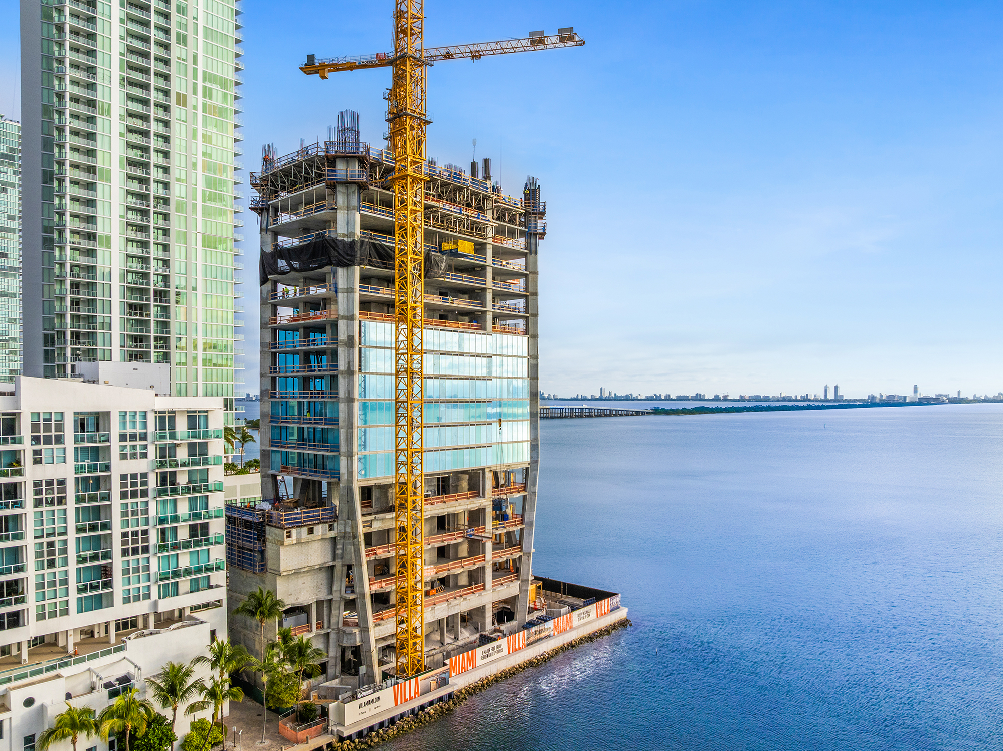Vertical construction has reached 21 floors at Villa Miami, a 56-story, 650-foot waterfront residential tower rising along Biscayne Bay at 710 NE 29th Street in Miami’s Edgewater neighborhood. The development will contain 70 half-floor and full-floor condominium residences and is being developed by Terra in partnership with One Thousand Group and Major Food Group, with architecture by ODP Architects and interiors by AD100 designer Vicky Charles.