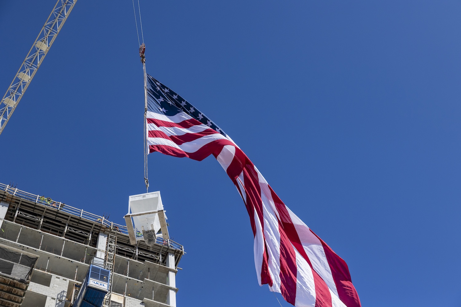 The topping out ceremony, held on February 12, brought together members of the development team, local officials, and project partners to commemorate the milestone. In keeping with construction tradition, a tree and an American flag were hoisted at the start of the event. The final beam was signed by project leaders and crew members in recognition of the achievement. More than 400 construction workers and team members have worked on the project to date.