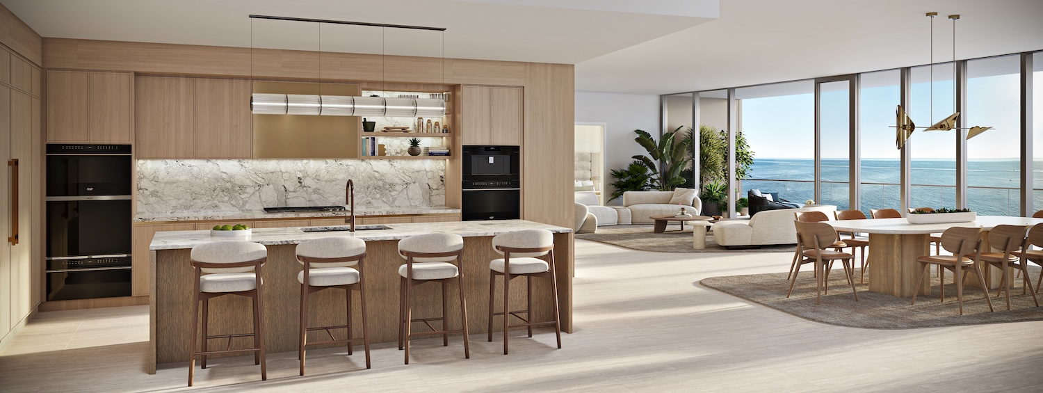Across the penthouse collection, residences feature floor-to-ceiling windows designed to frame views of the Atlantic Ocean and Intracoastal Waterway, along with custom Italian kitchens equipped with premium appliances. Additional components include expansive balconies, dens, powder rooms, walk-in laundry areas, and spa-inspired primary bathrooms with walk-in showers, soaking tubs, Kohler fixtures, and ocean-facing layouts.