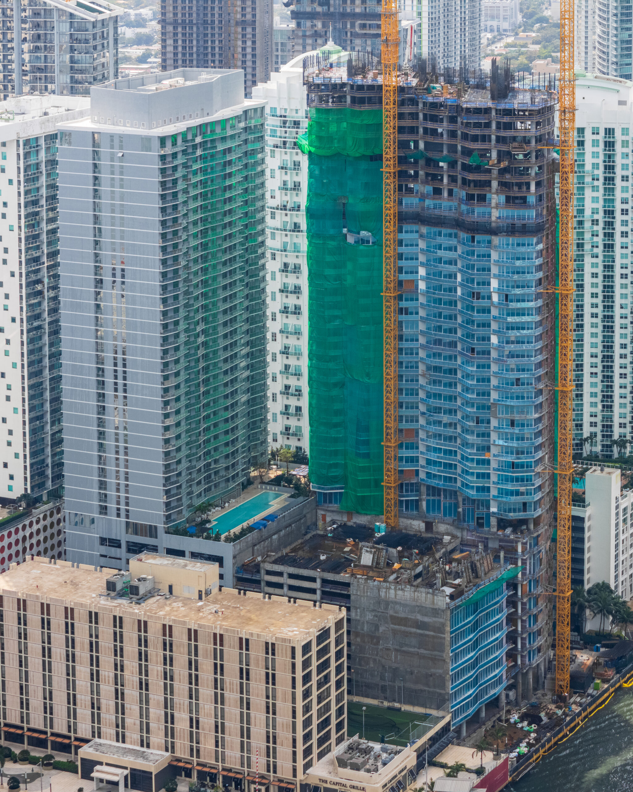 Recent aerial photographs show the reinforced concrete superstructure approaching the midpoint of the building’s planned height. Decking has reached the 40th floor, though at the time the images were captured portions of the 39th floor slab were still being poured. The uppermost levels display a dense mix of formwork tables, shoring, and exposed vertical reinforcement cages awaiting concrete placement. Two tower cranes extend prominently above the structure and continue to support the ongoing climb of the superstructure along the riverfront site. The image below also shows the adjacent Viceroy Brickell, with Baccarat Residences Miami already rising noticeably above it.