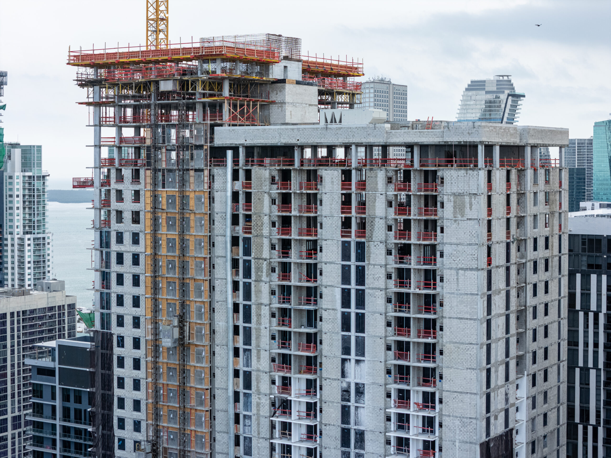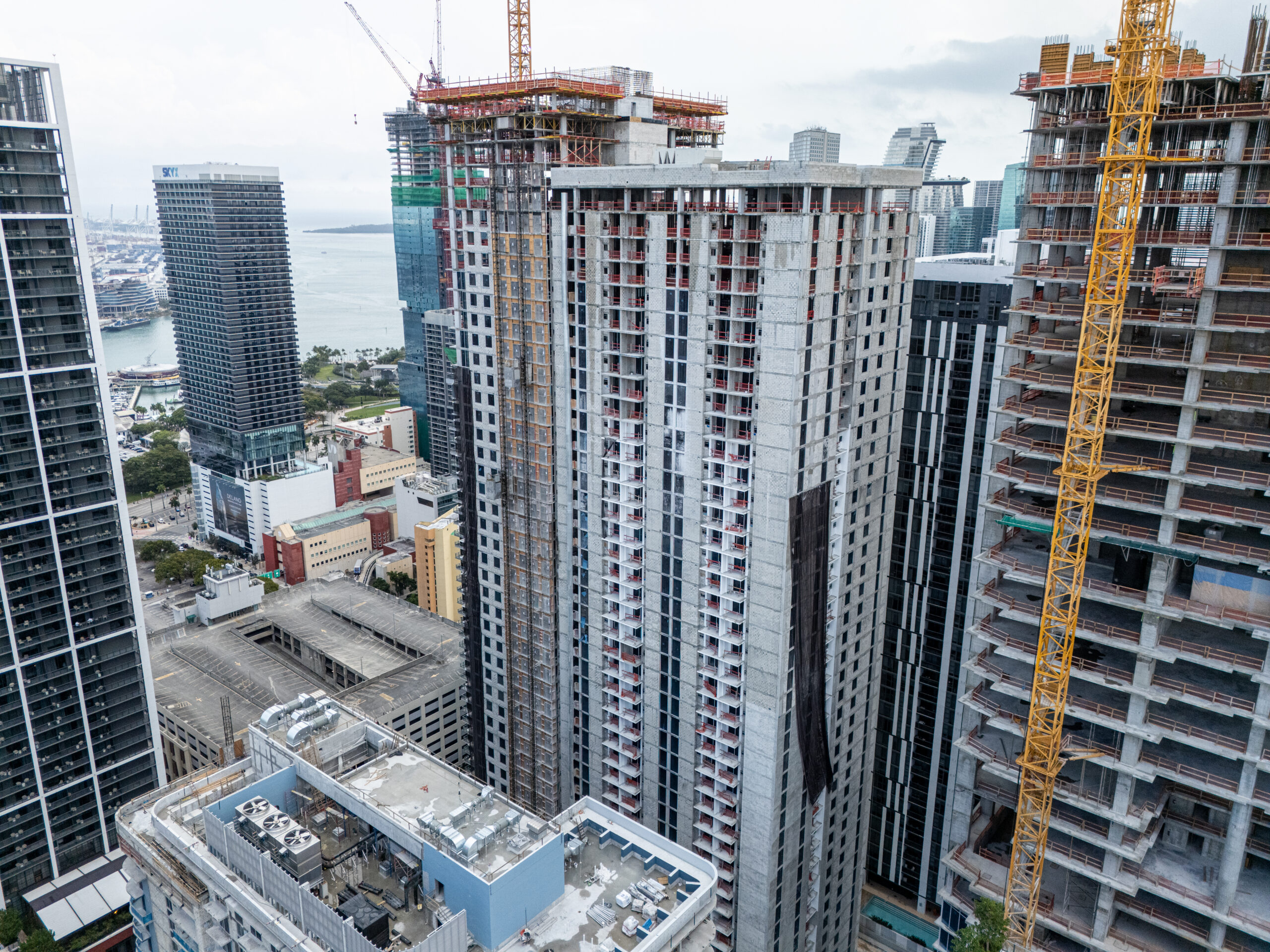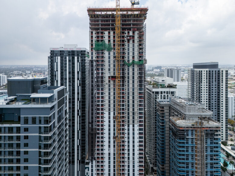 Recent aerial photos show the project has progressed rapidly since groundbreaking, with interior build-out now underway through the 40th floor and exterior glass installation advancing through the 50th floor. The structure now stands among a growing cluster of high-rise developments surrounding the Miami Worldcenter district, where a wave of residential construction is reshaping the northern portion of Downtown Miami.