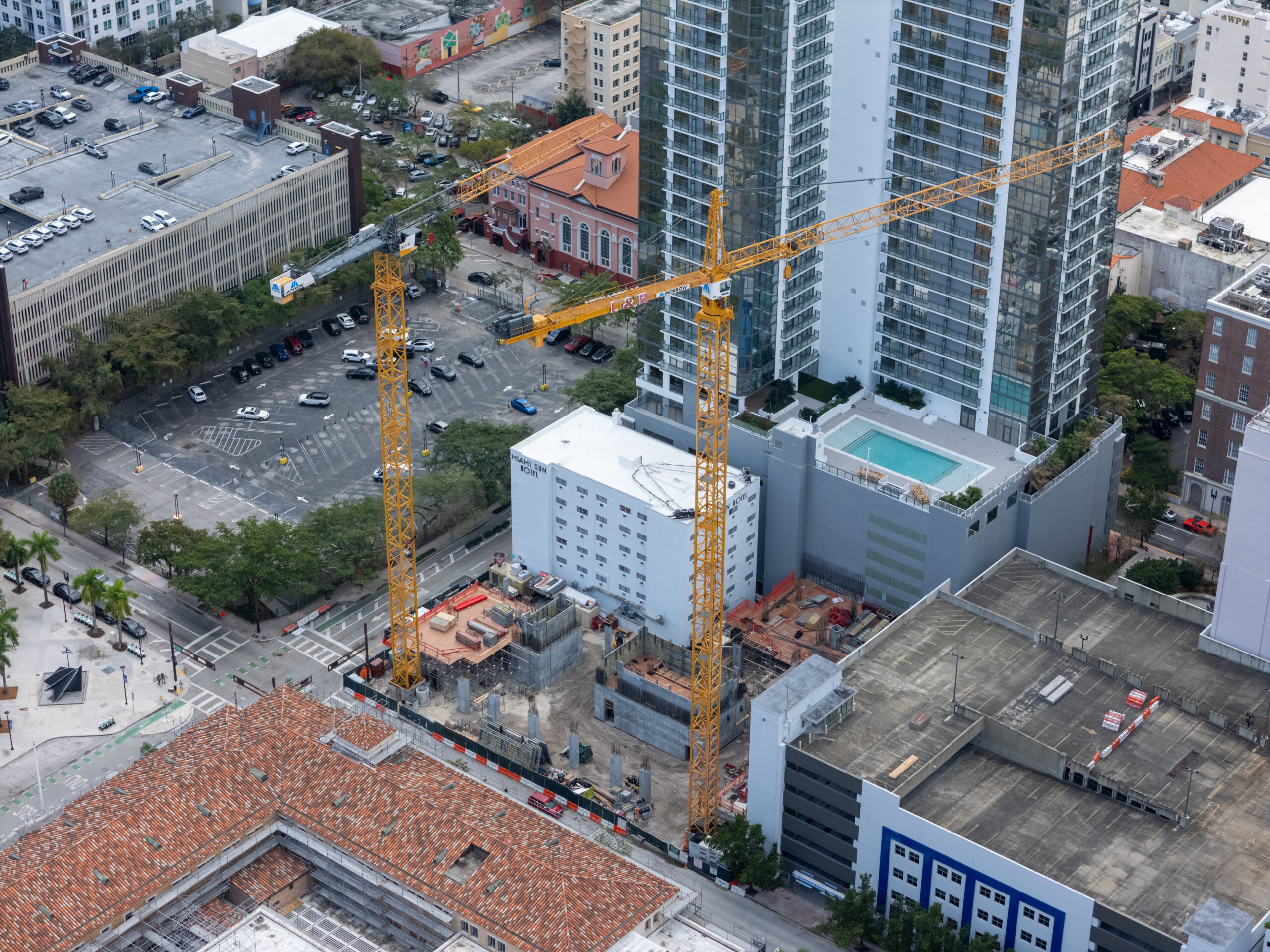 Recent aerial photography highlights the site’s constrained urban footprint, with the Miami Sun Hotel nestled directly between the completed first tower and the active Phase II site. Despite the tight quarters, two tower cranes now rise above the property. Reinforced concrete columns, shear walls, and formwork outline the second tower’s footprint, and the initial elevated slabs mark the early stages of the building’s superstructure and podium.