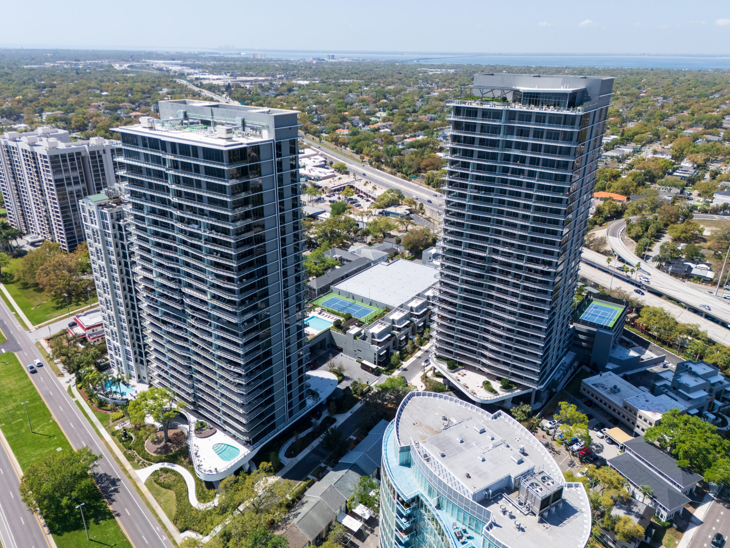 Recent aerial photographs show the two towers of The Ritz-Carlton Residences, Tampa, appearing complete at their respective addresses of 3101 Bayshore Boulevard (Tower I) and 3015 S. Ysabella Avenue (Tower II) in South Tampa. Developed by Related Group, the waterfront condominium complex was designed by Arquitectonica, with interiors by Meyer Davis, landscape design by Enzo Enea, and Coastal Construction served as the general contractor.