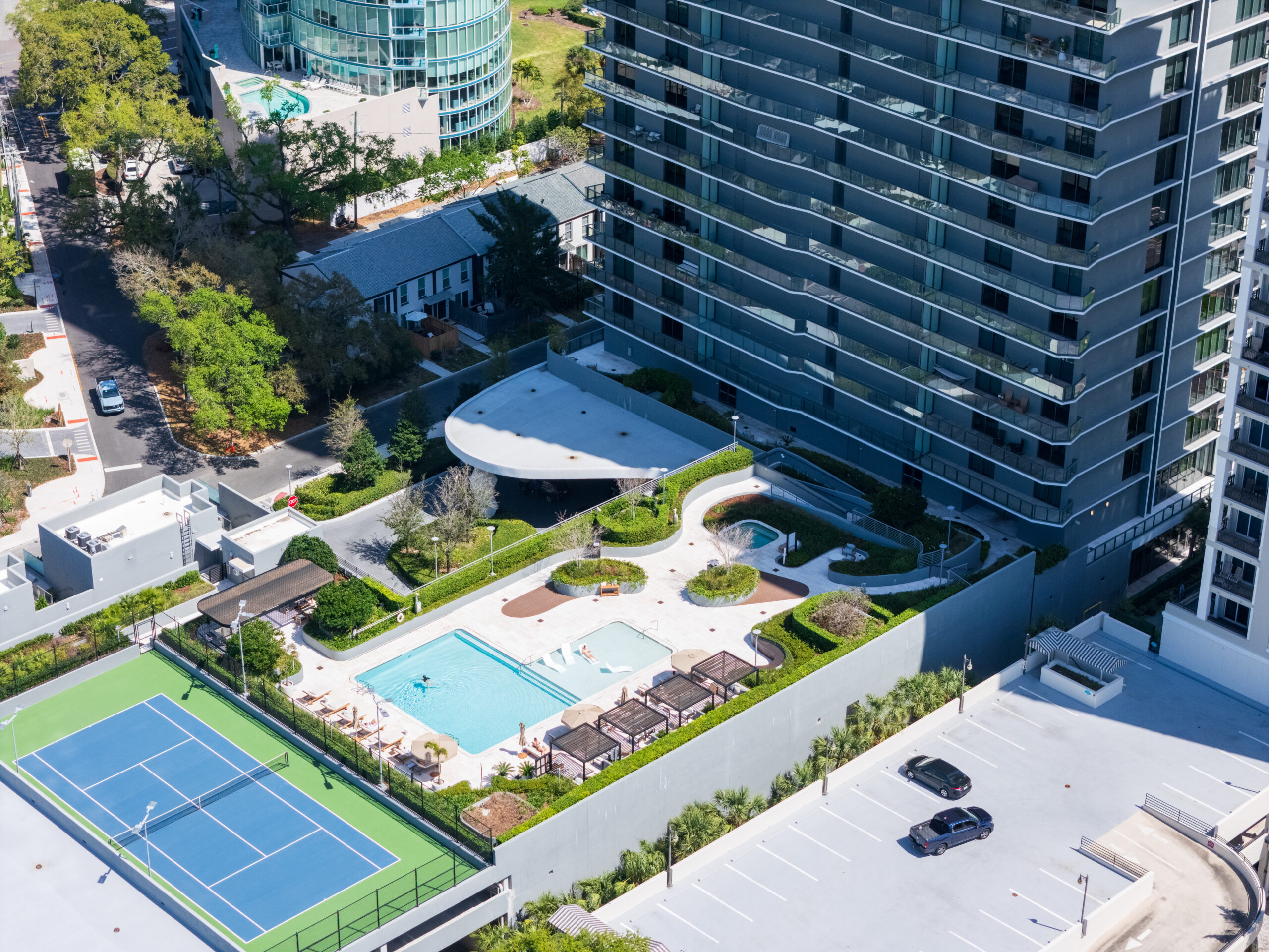 These recent aerial views show the development in what appears to be its finished state. Both towers are fully topped out and enclosed, with curtain wall installation and balcony railings in place from base to crown. The surrounding grounds also appear substantially complete, with resort-style pools, private cabanas, tennis and pickleball courts, planted walkways, paved drop-off areas, and outdoor gathering spaces visible throughout the site. From above, the property no longer reads as an active construction site, but as a completed waterfront residential complex.