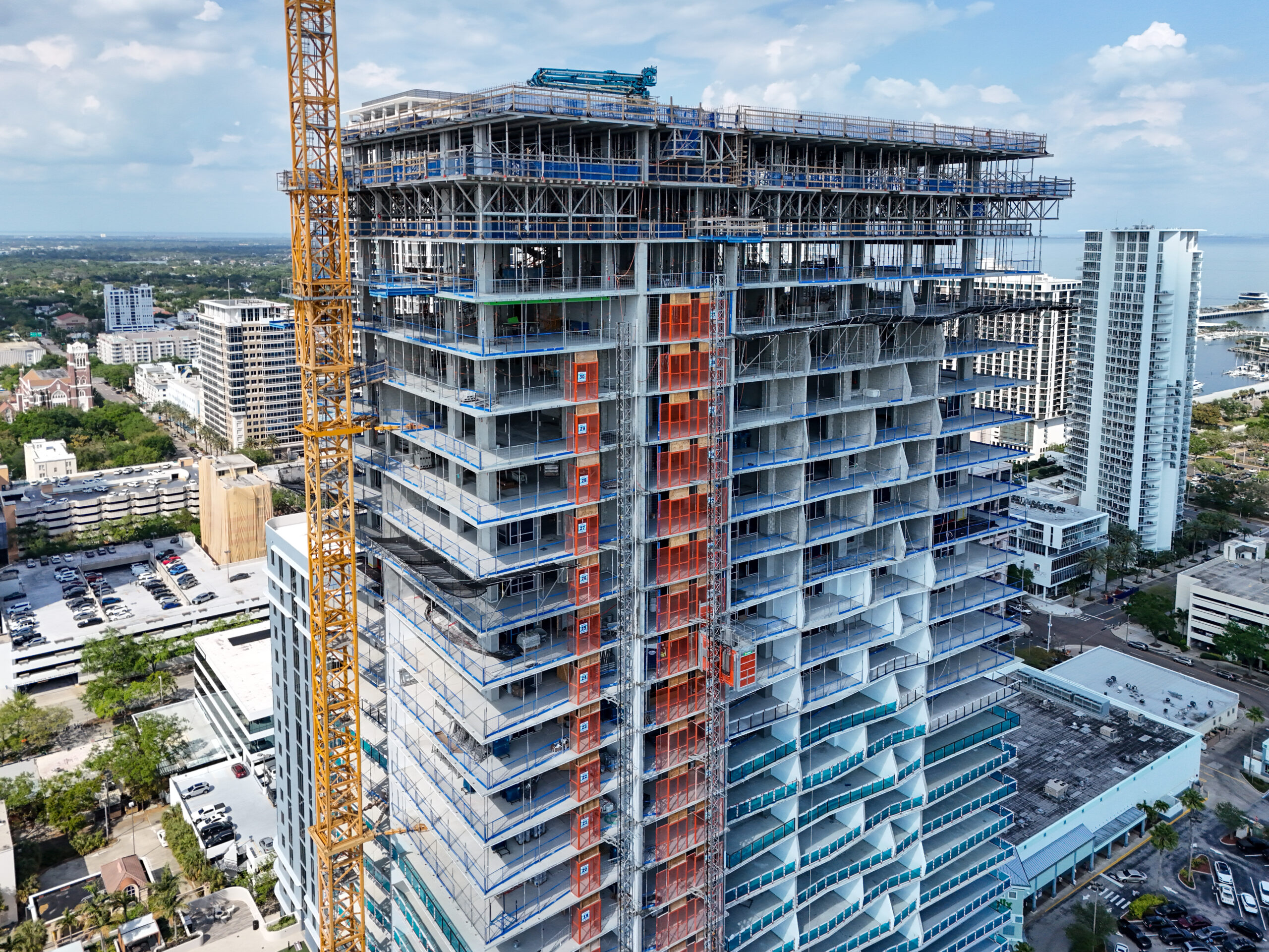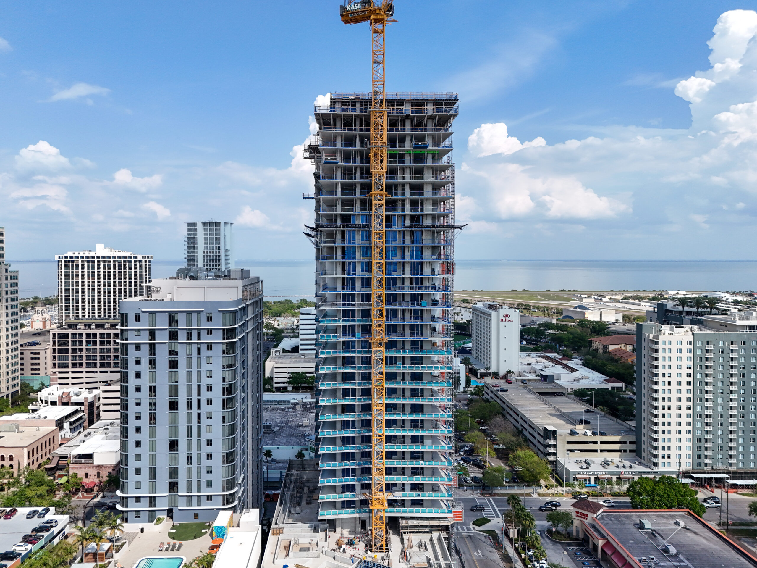 Recent aerial photos show the full concrete shell standing above the surrounding downtown context, with the KAST tower crane still in position at the building’s core and scaffolding remaining on the upper floors. Glazing installation is progressing on the lower residential and podium levels. The angular balcony slabs are visible throughout the residential floors, projecting outward from the concrete frame at each level, with the elevator core cladding prominent along the building’s spine. Tampa Bay is visible in the background from multiple vantage points.