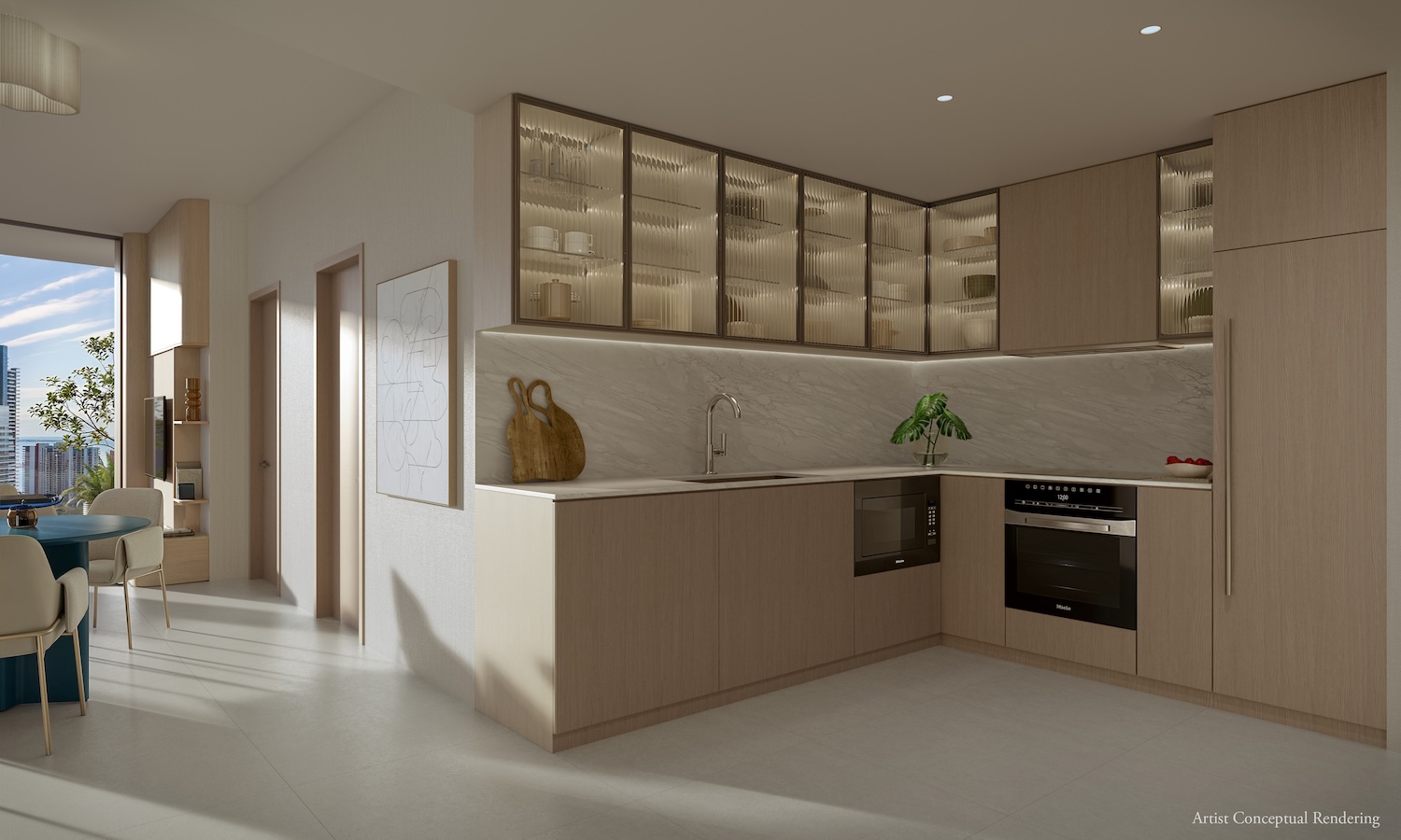 The tower is planned to yield 467 fully furnished condominium residences, with layouts ranging from studios to three-bedroom units. Interiors are specified to include Italian kitchens with custom countertops and backsplashes, Miele appliance packages, Italkraft kitchen and bathroom cabinetry, WaterWorks bathroom fixtures, finished surfaces in wet areas, contemporary lighting packages, and built-out primary bedroom closets. Residences will also incorporate integrated smart home systems.