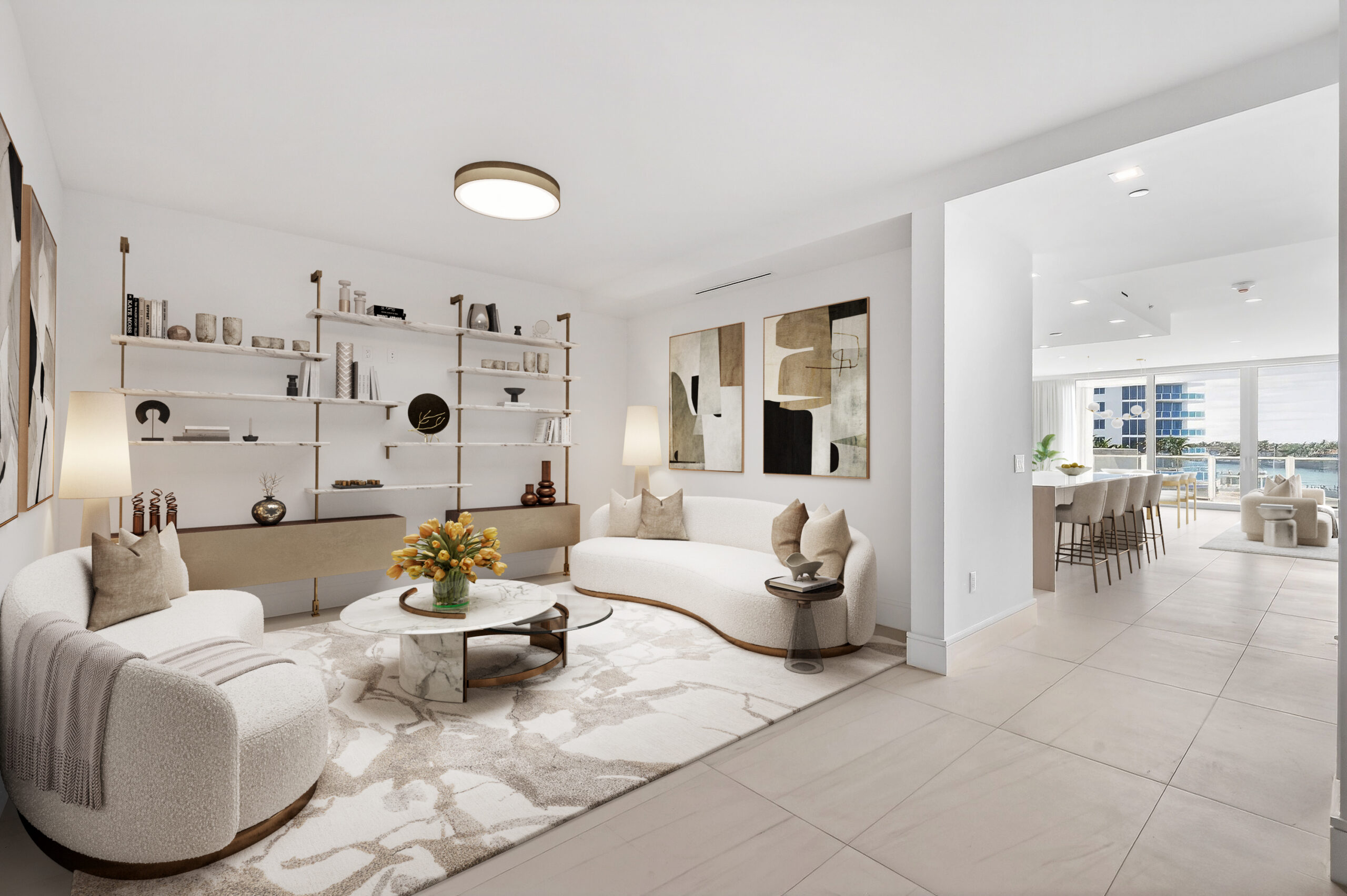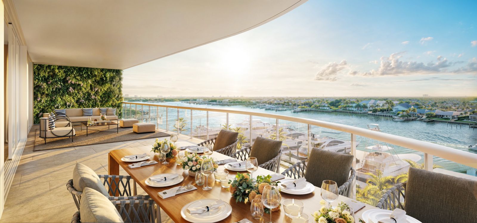 The residences are designed in three- to five-bedroom layouts with dedicated dens and flow-through floor plans intended to capture natural light and water views from multiple exposures. Large terraces extend the living areas outdoors with separate spaces for lounging and dining along the Intracoastal frontage.