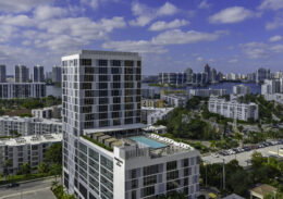 Construction has topped out at One Brickell Riverfront, a dual-tower condominium development rising at 99 SW Seventh Street in Miami’s Brickell neighborhood. Developed by Newgard Group and Two Roads Development, with construction led by G.T. McDonald, the project consists of two residential towers sharing a unified podium along the Miami River. LOFTY Brickell rises 44 stories and contains 362 fully furnished condominium residences, while The Standard Residences, Brickell will reach 46 stories and include 422 units. Both towers were designed by Arquitectonica.